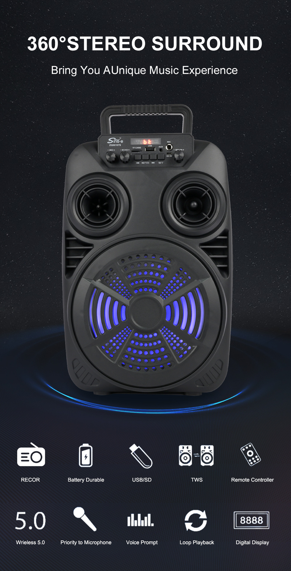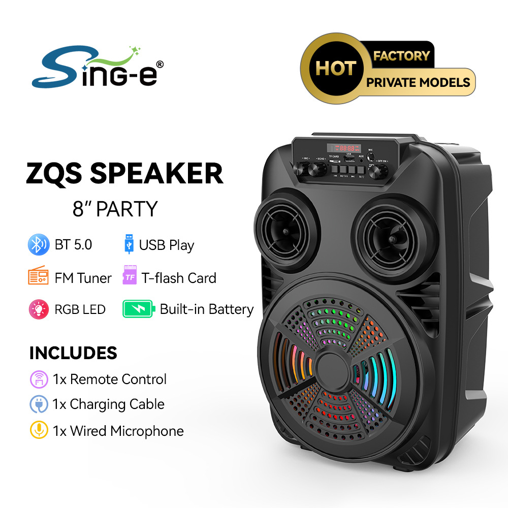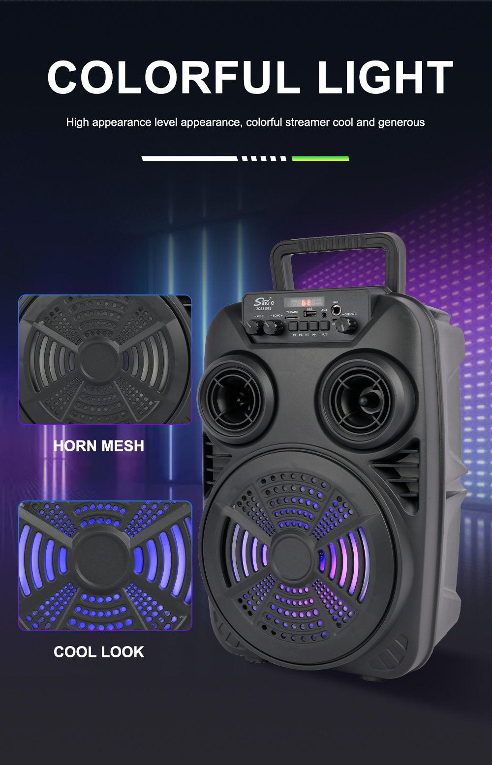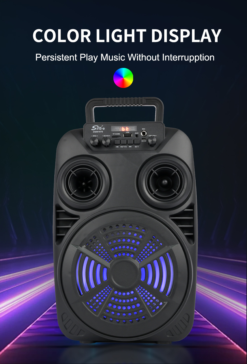 支持USB/TF/FM/AUX/蓝牙,带麦克风功能。带遥控功能。旋钮调控音量。带屏,带喇叭七彩灯。