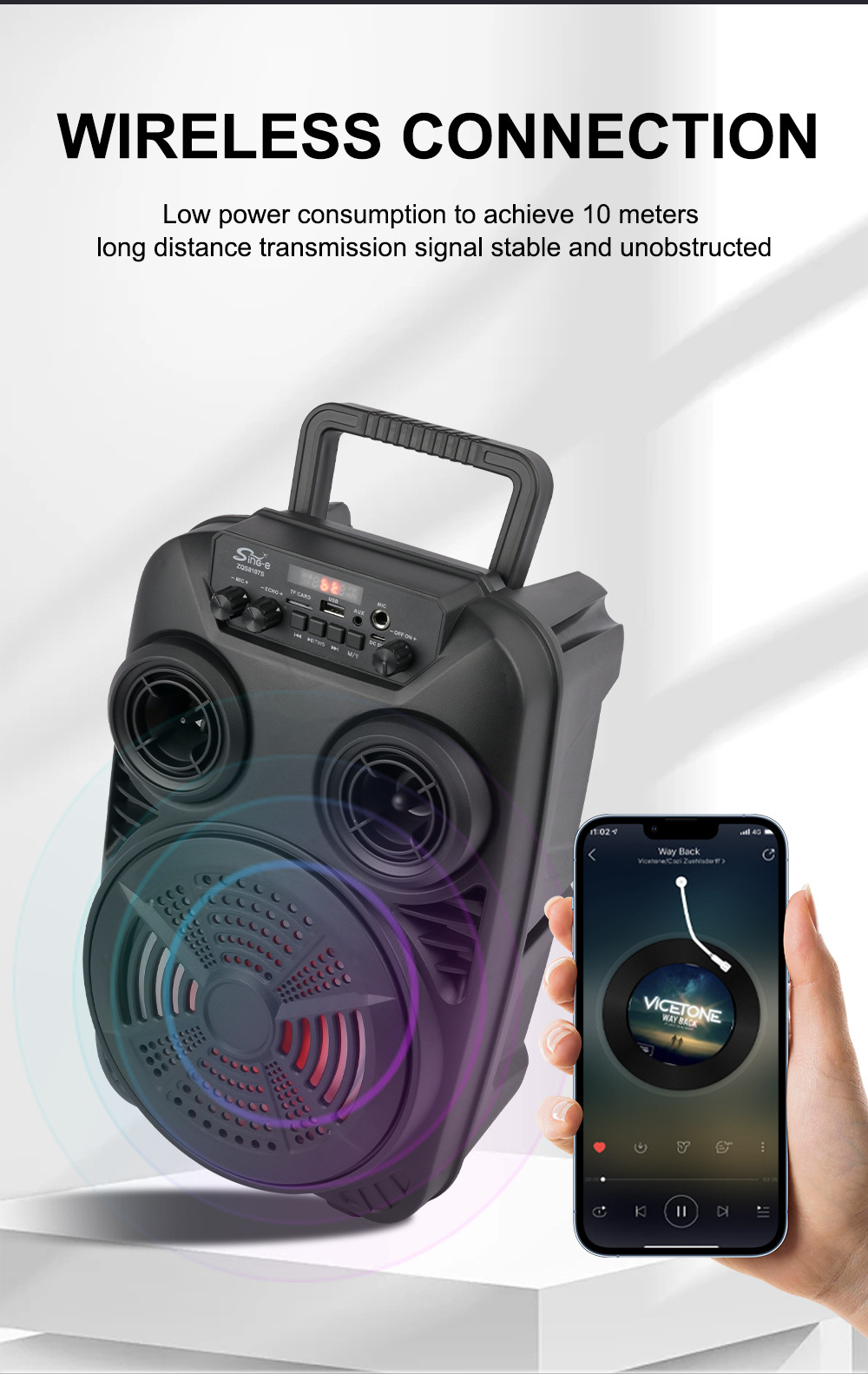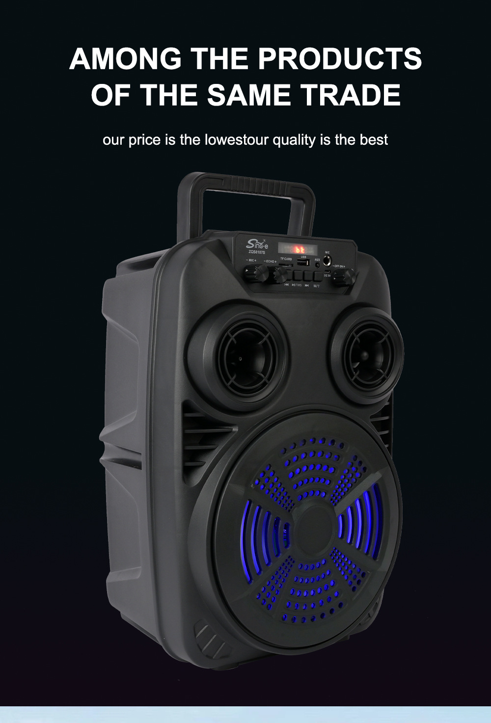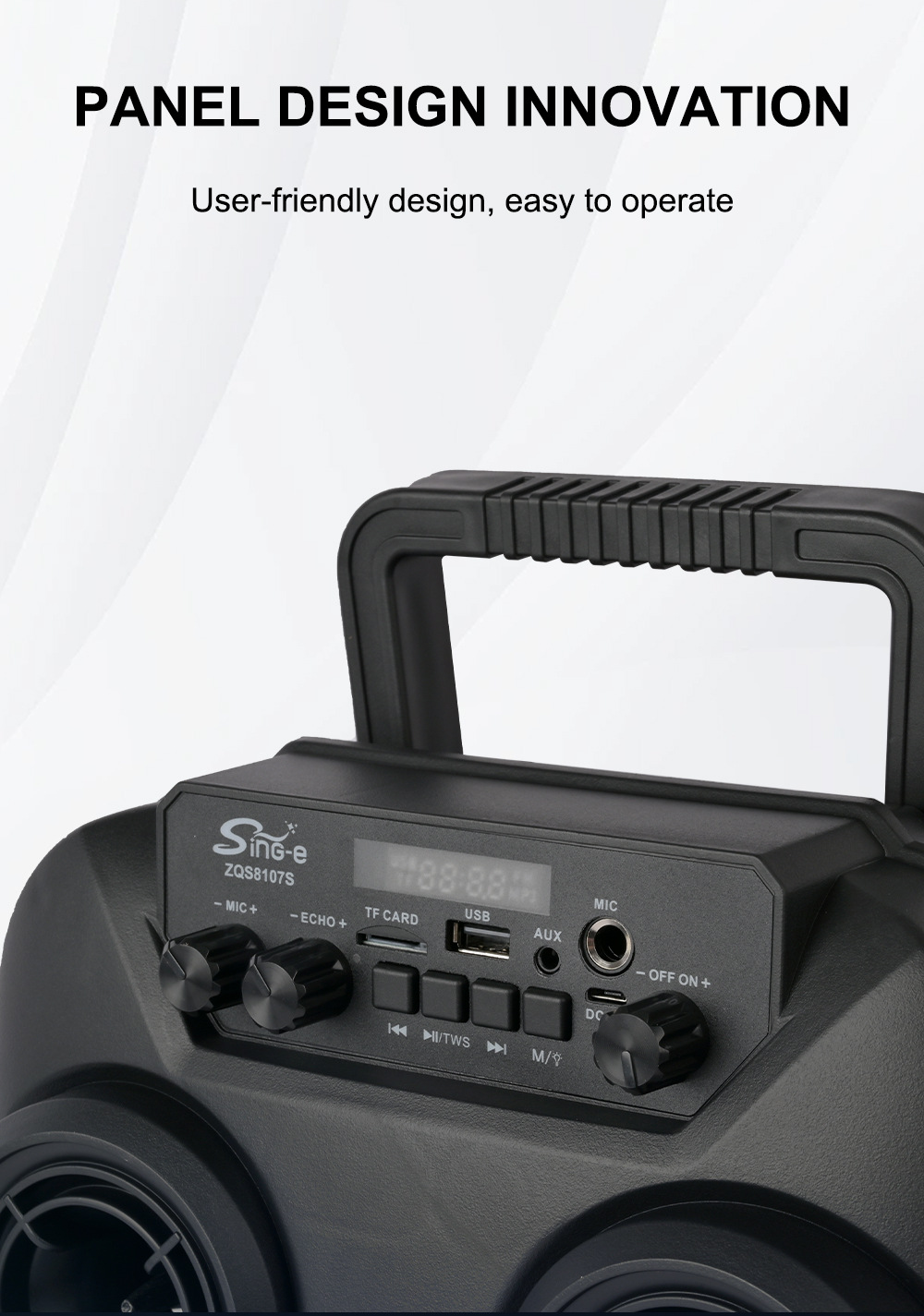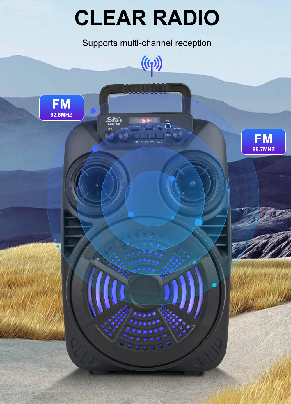 支持USB/TF/FM/AUX/蓝牙,带麦克风功能。带遥控功能。旋钮调控音量。带屏,带喇叭七彩灯。