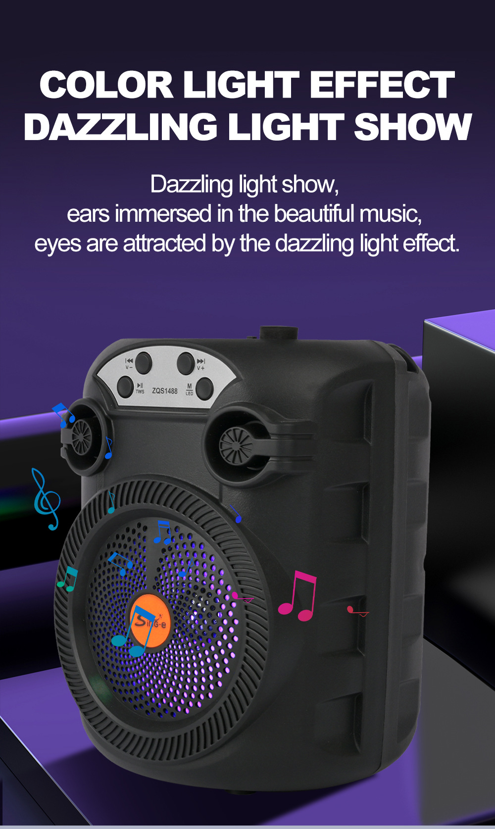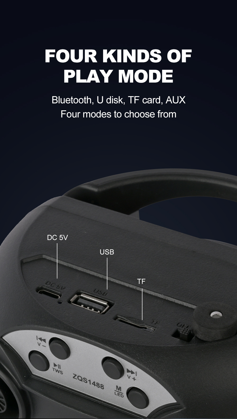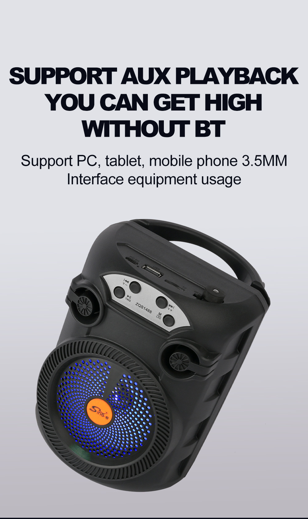 带BT/USB/TF卡、DC-5V充电(Type-c座),2018单功放、带充电管理IC、按键音量,带七彩灯、七彩受MODE控制,带太阳能充电。