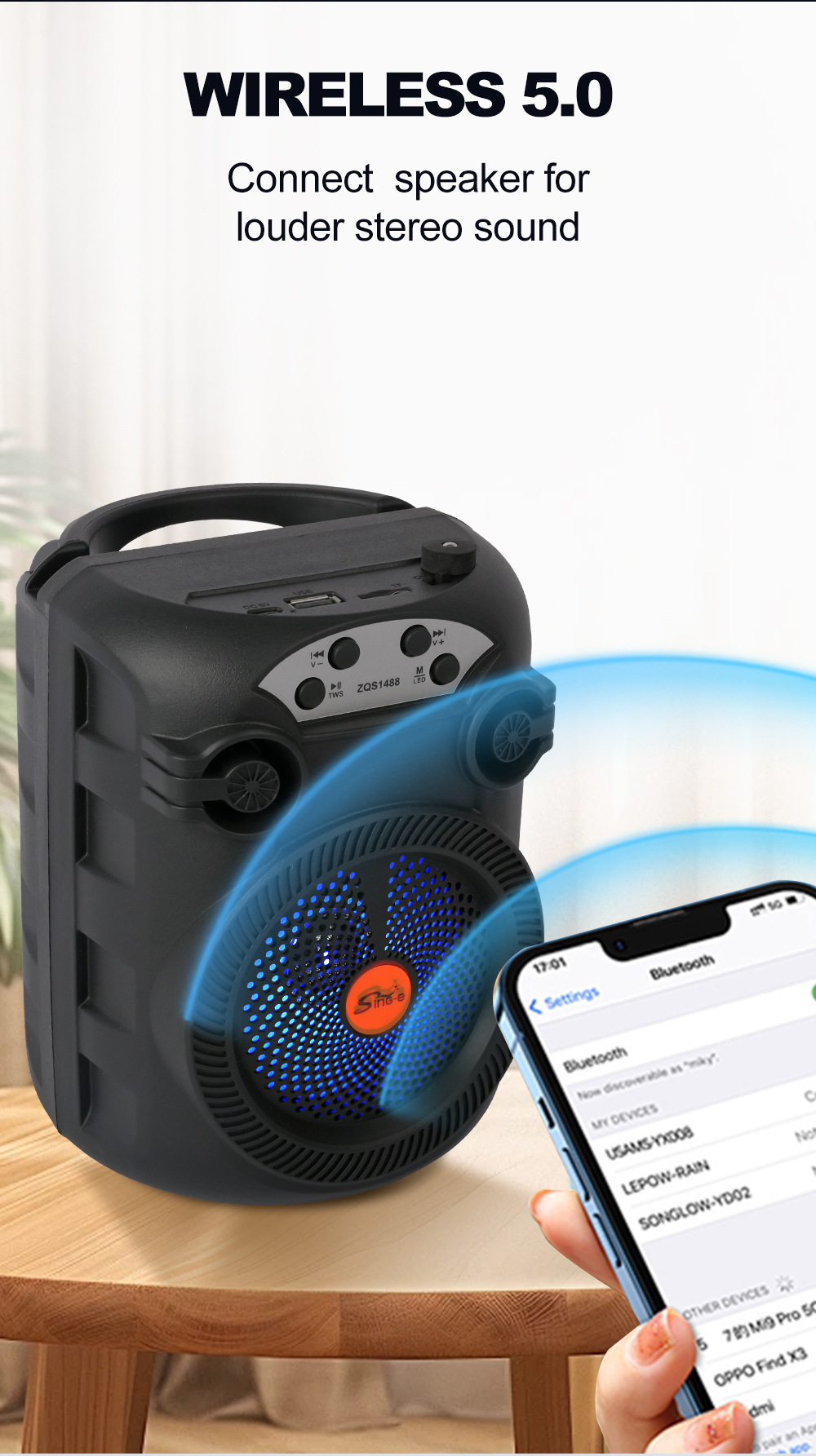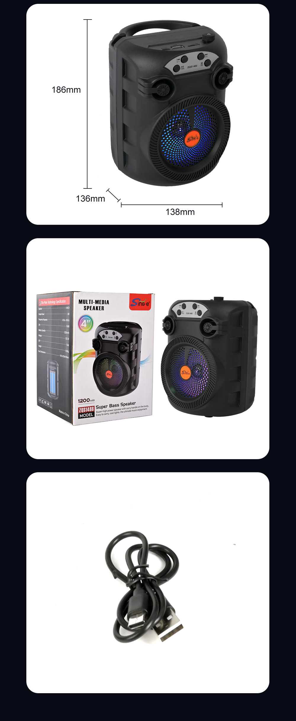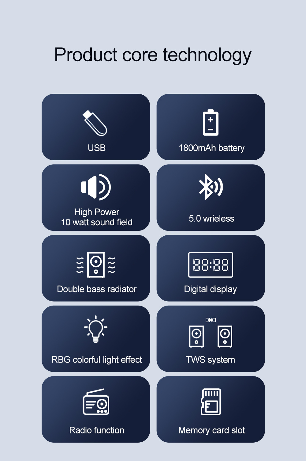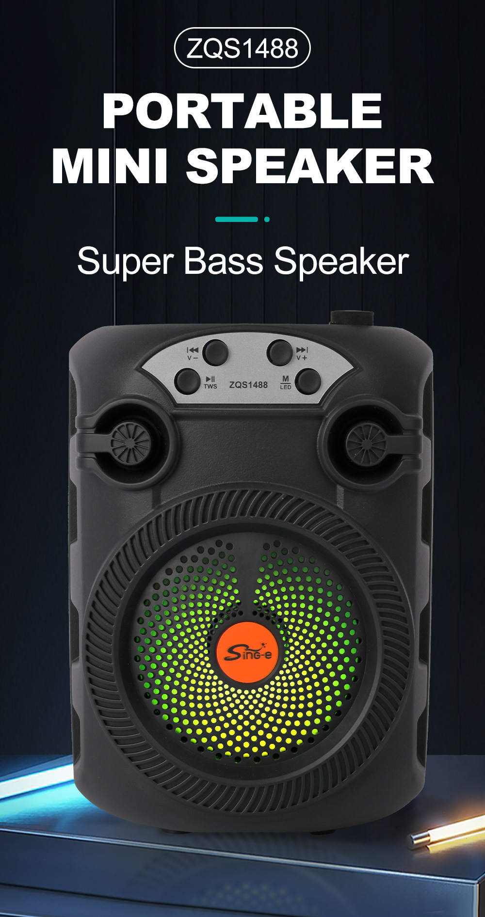 带BT/USB/TF卡、DC-5V充电(Type-c座),2018单功放、带充电管理IC、按键音量,带七彩灯、七彩受MODE控制,带太阳能充电。