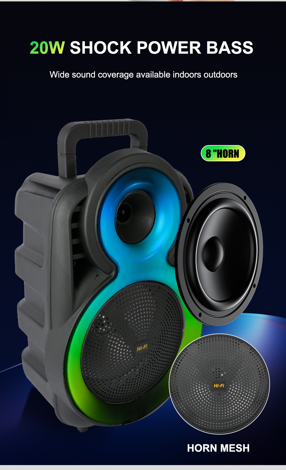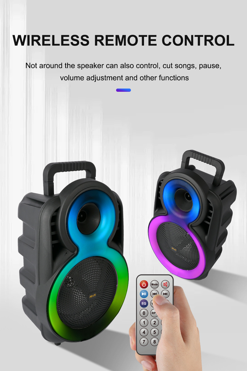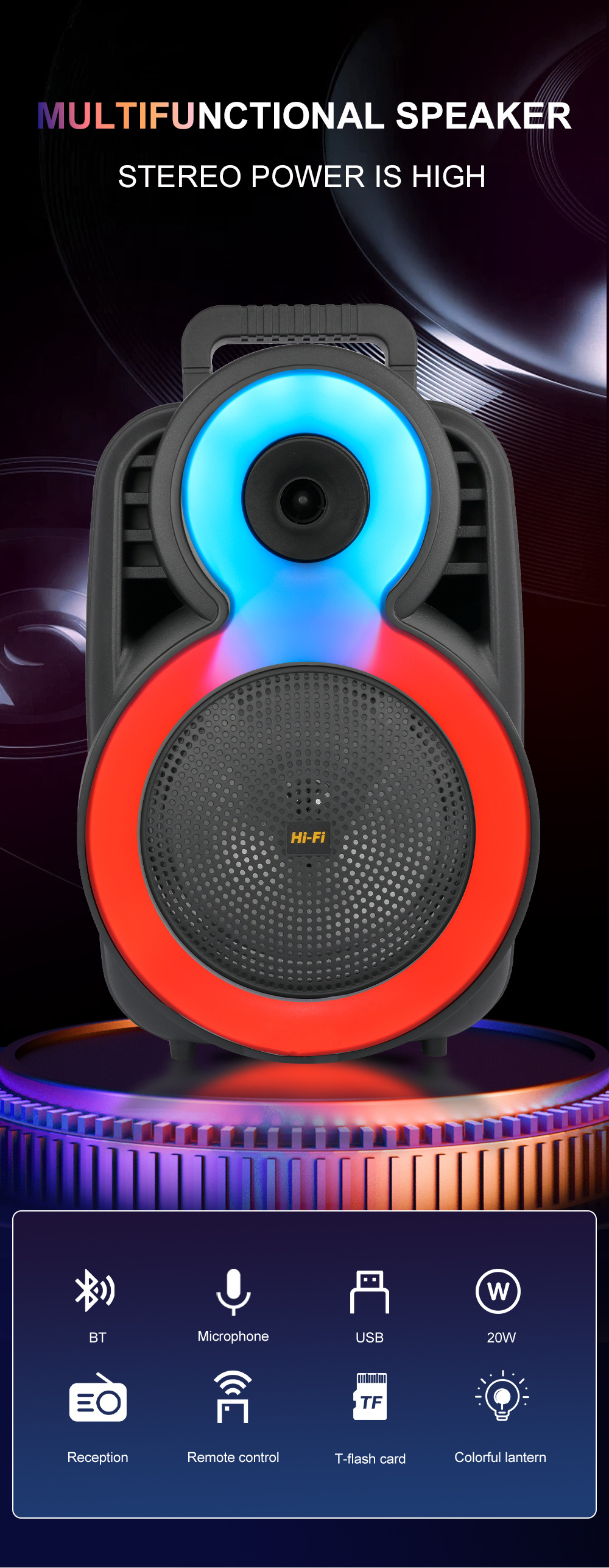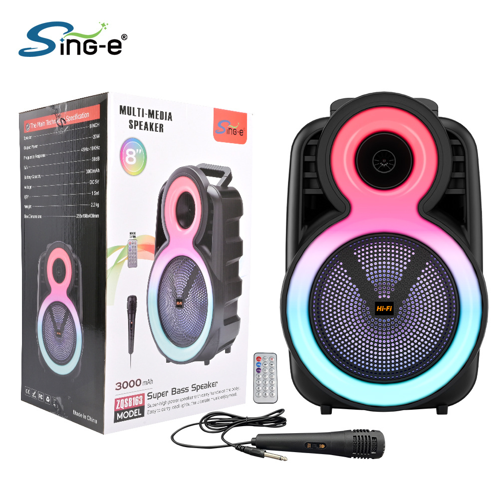 +带锂电保护、麦克风功能,单功放、电位器音量、对箱功能,带幻彩,幻彩受MODE控制。