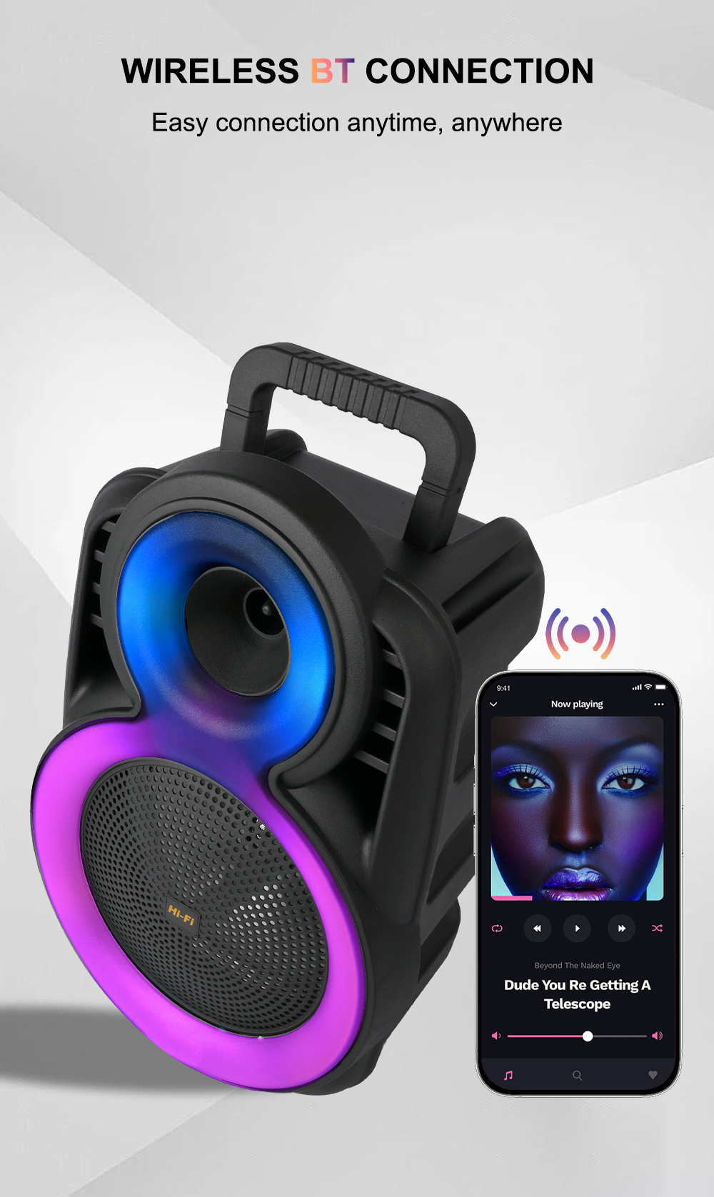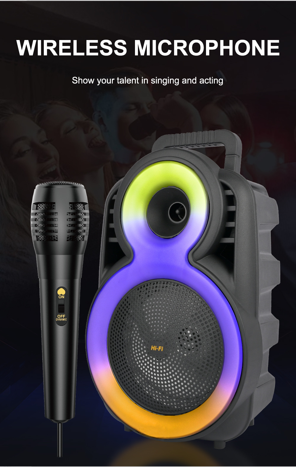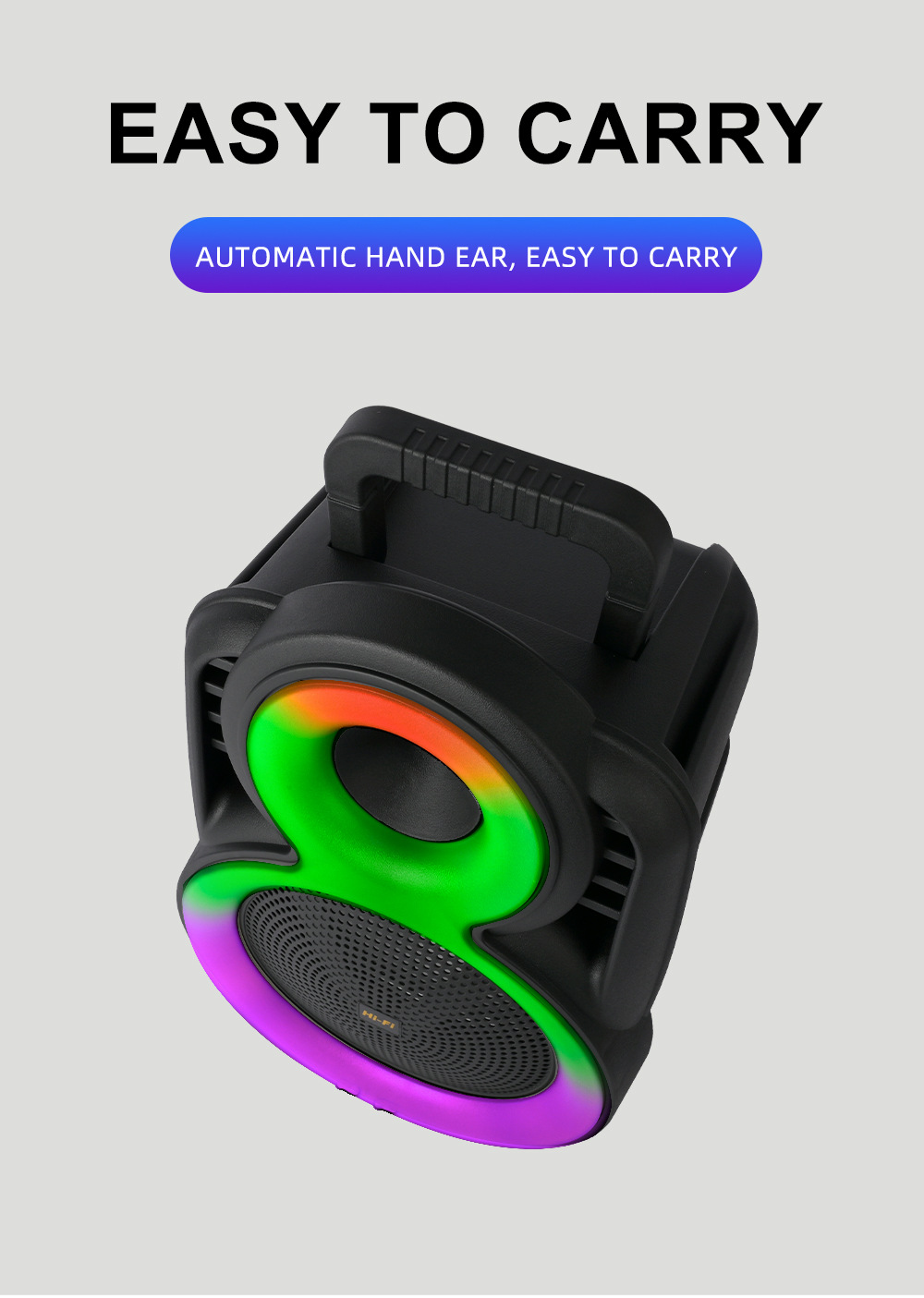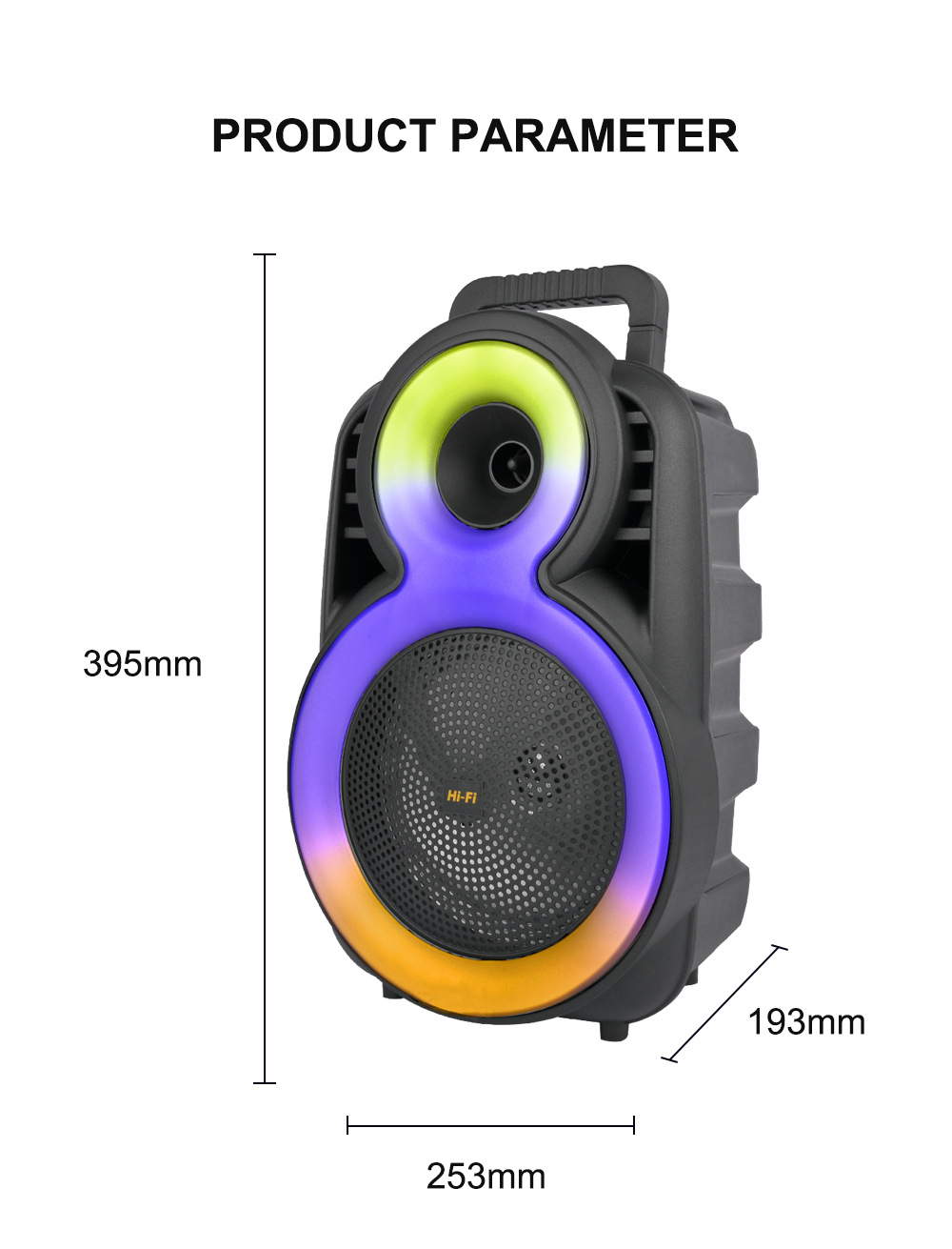 +带锂电保护、麦克风功能,单功放、电位器音量、对箱功能,带幻彩,幻彩受MODE控制。
