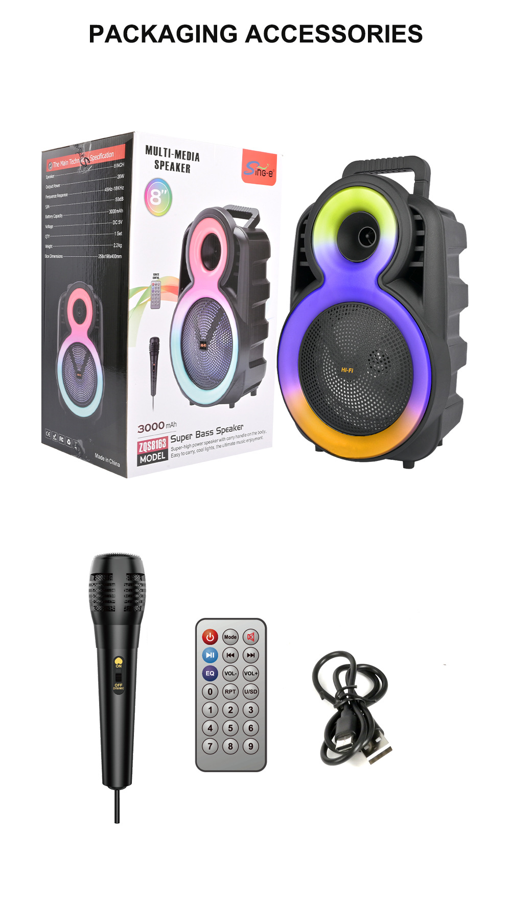 配件:充电线.有线话筒.遥控器,说明书
