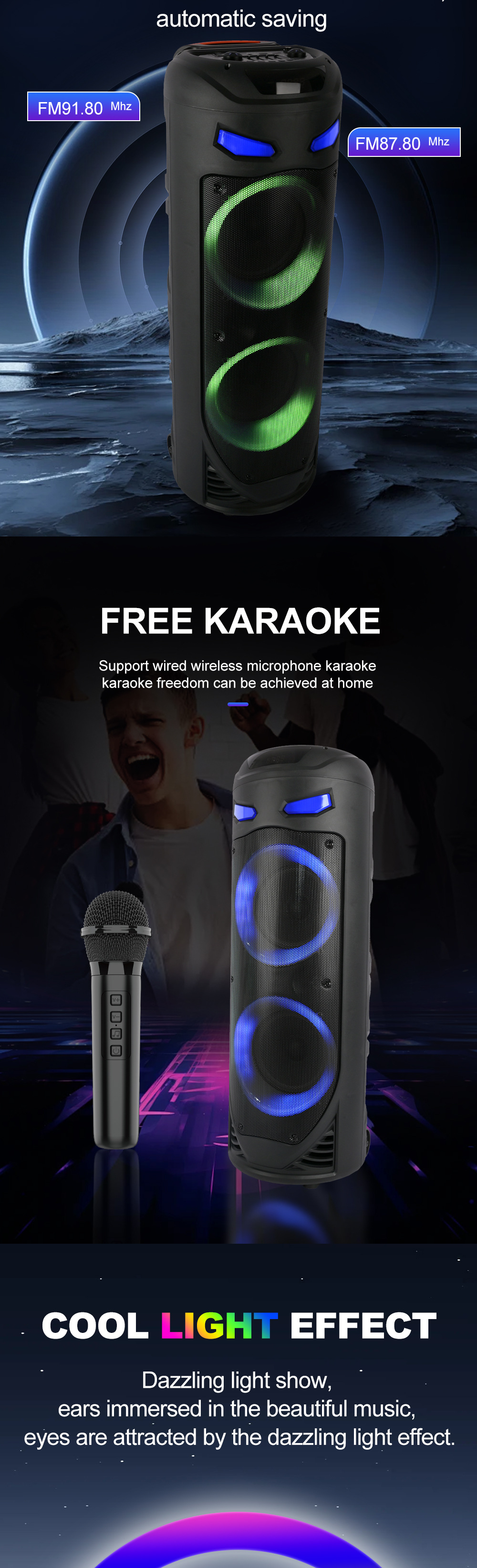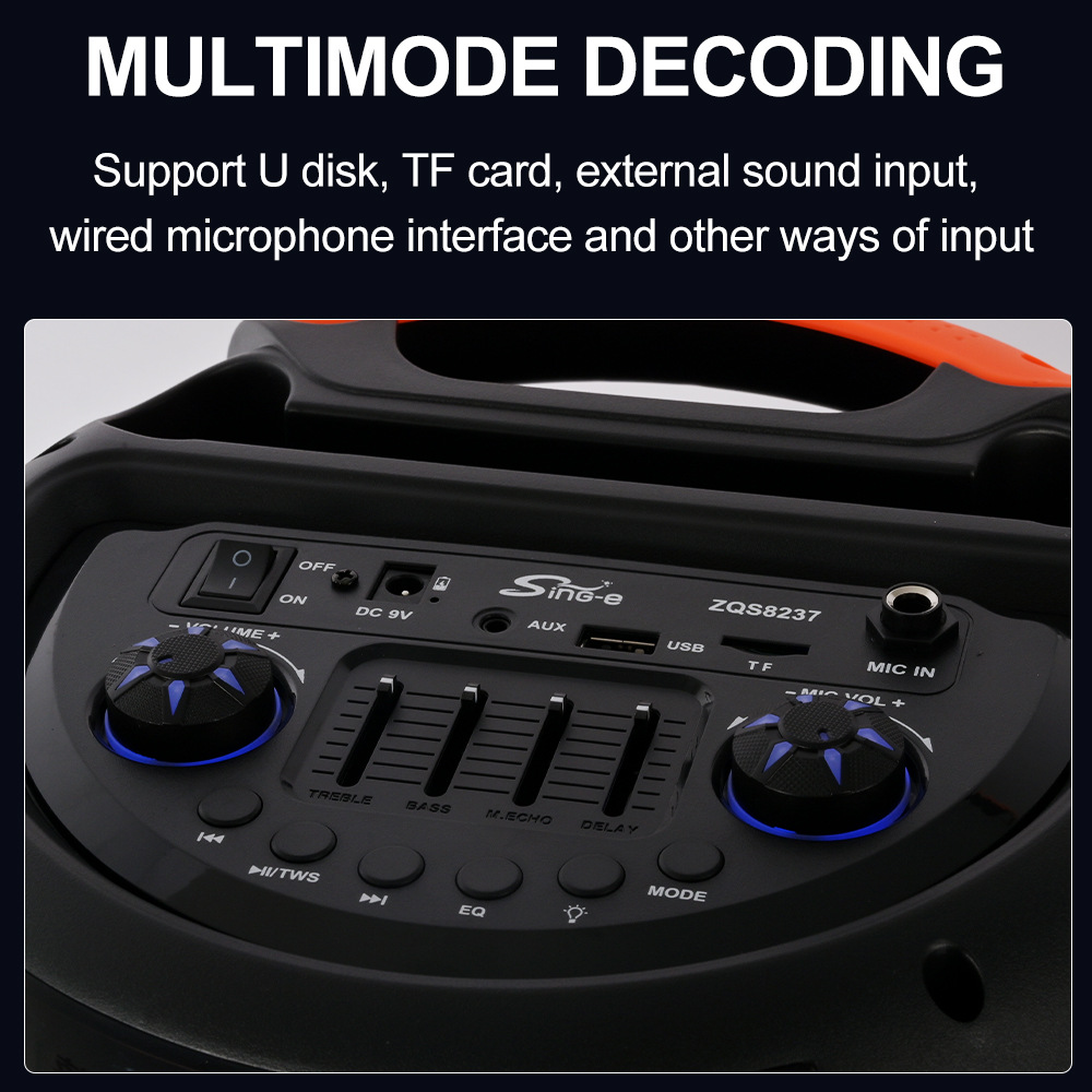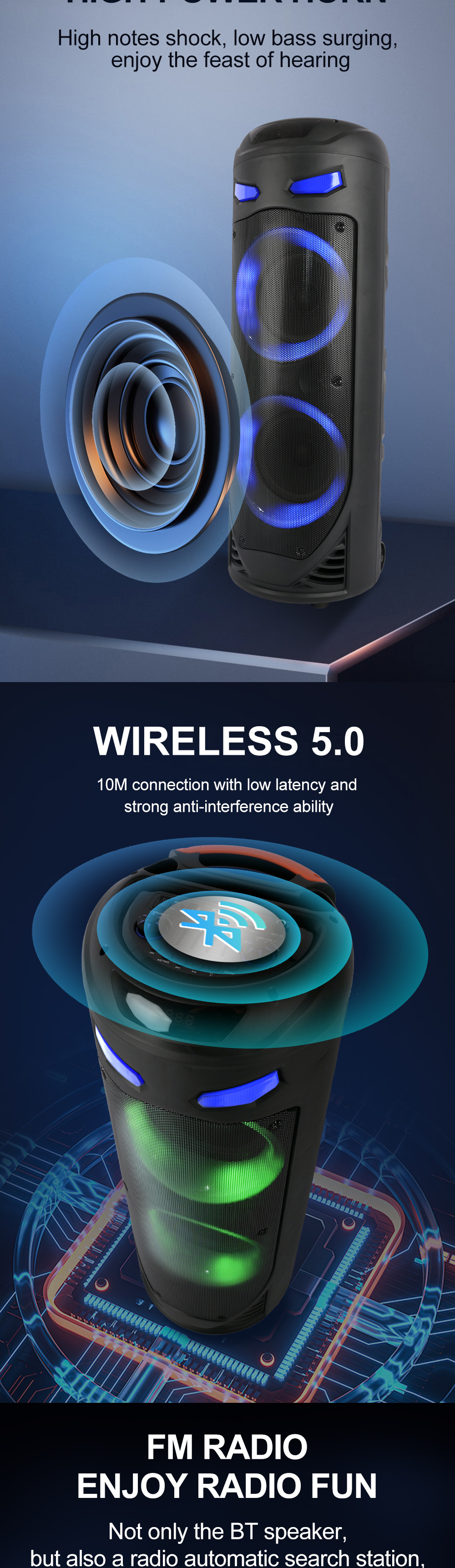 带BT/USB/TF卡/MIC/FM/AUX/带遥控,带显示屏+USB带5V稳压/无锂电保护/电位器音量、带无线麦功能,CS8679E功放+高音/带幻彩灯/幻彩灯受LED按键控制、对箱功能