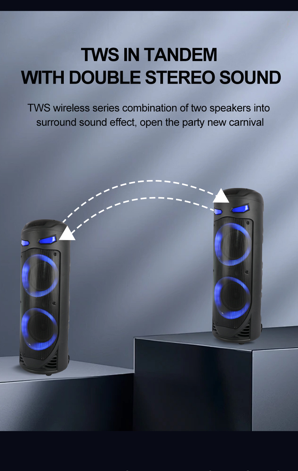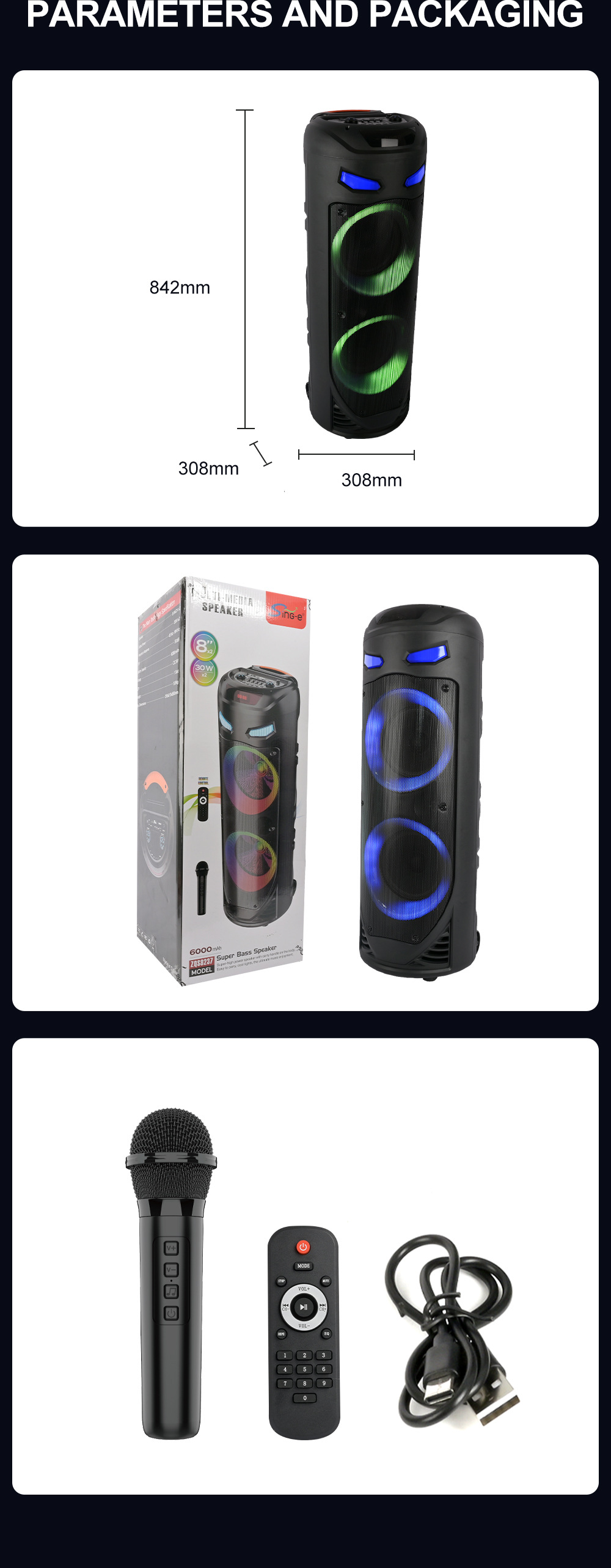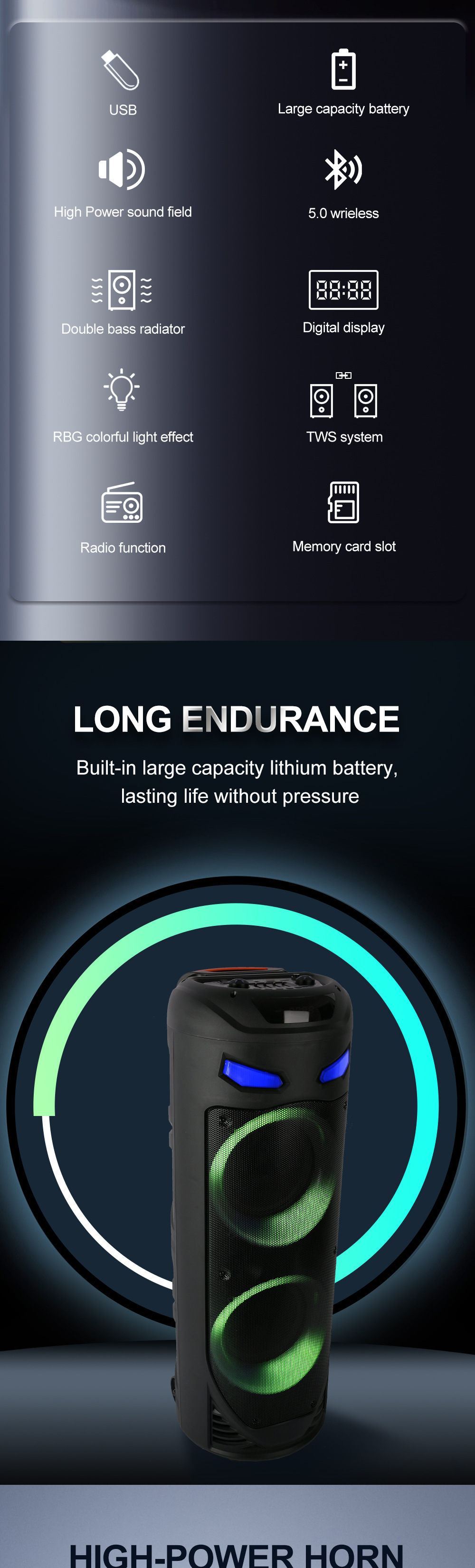 带BT/USB/TF卡/MIC/FM/AUX/带遥控,带显示屏+USB带5V稳压/无锂电保护/电位器音量、带无线麦功能,CS8679E功放+高音/带幻彩灯/幻彩灯受LED按键控制、对箱功能