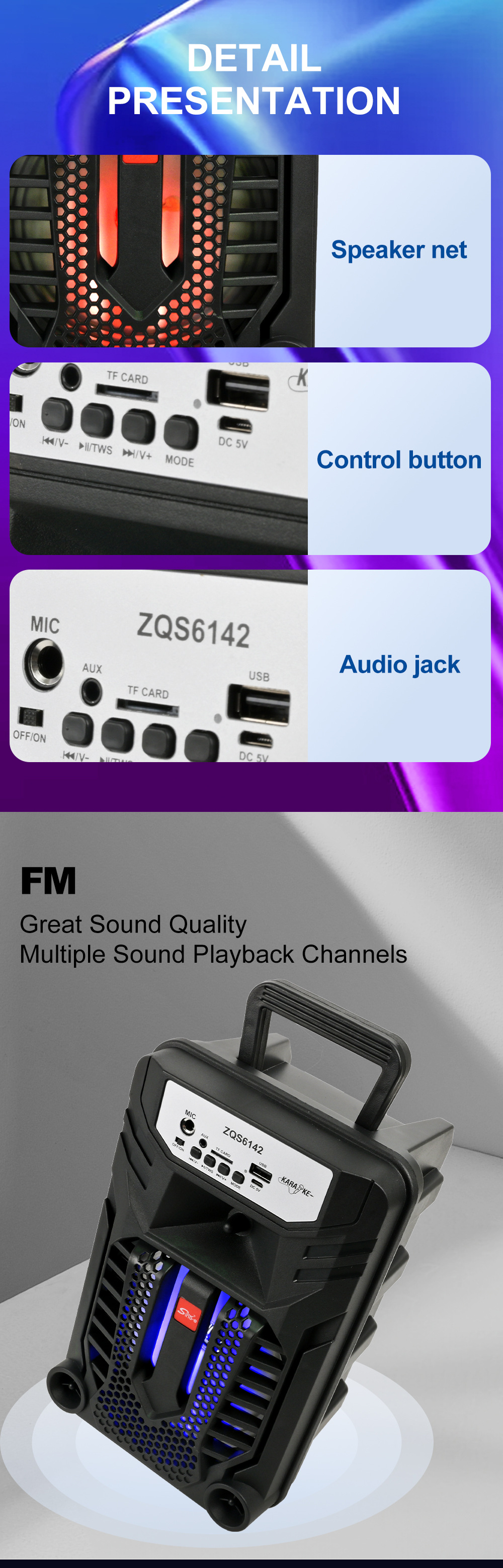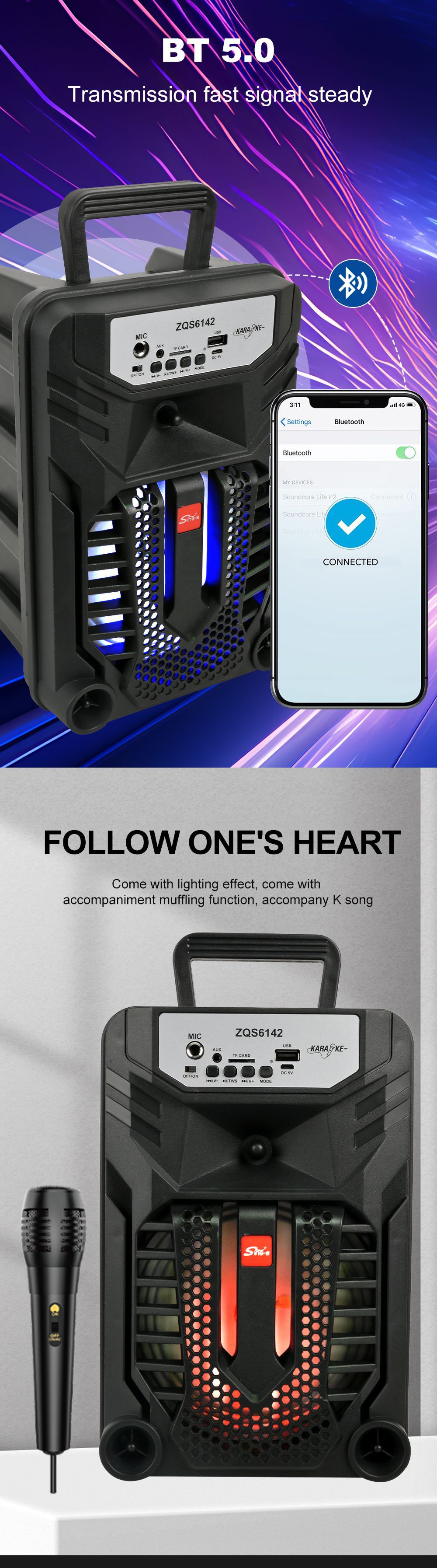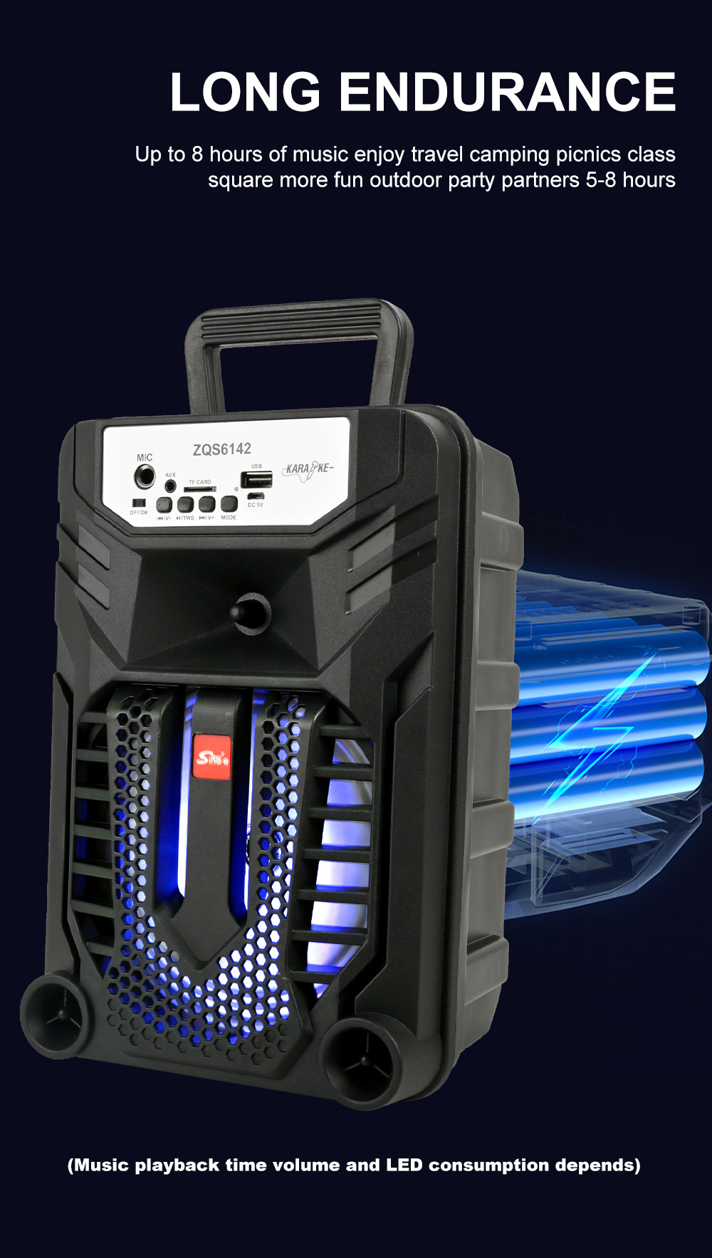 带蓝牙/带收音/带麦克风/无遥控+无屏/USB/TF卡/MIC/DC-5V充电/+USB不升压/带充电管理IC/按键音量+七彩灯不受MODE控制、对箱功能 电池规格:18650/3.7V/1200MAH