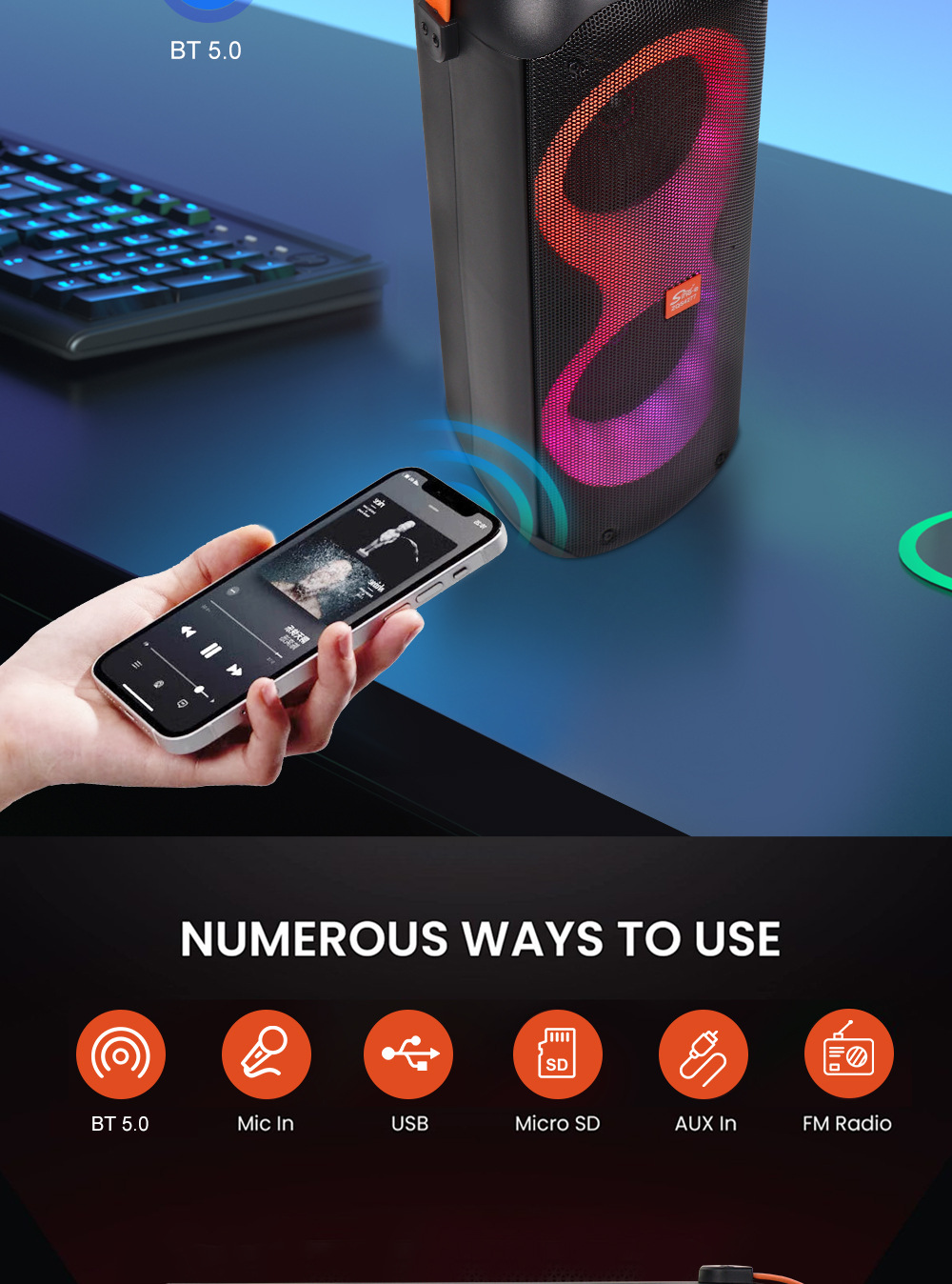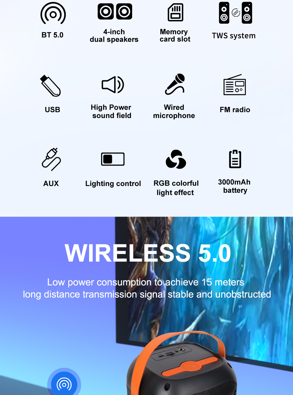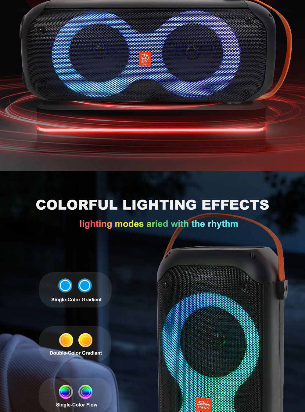 +对箱功能、按键音量、带锂电保护.+带幻彩灯、幻彩灯受灯键控制、
