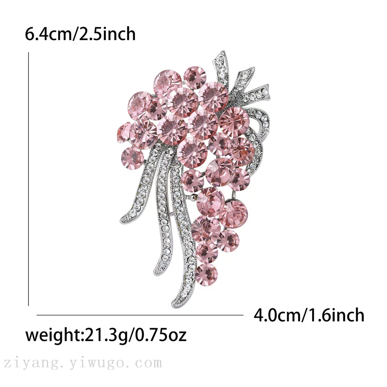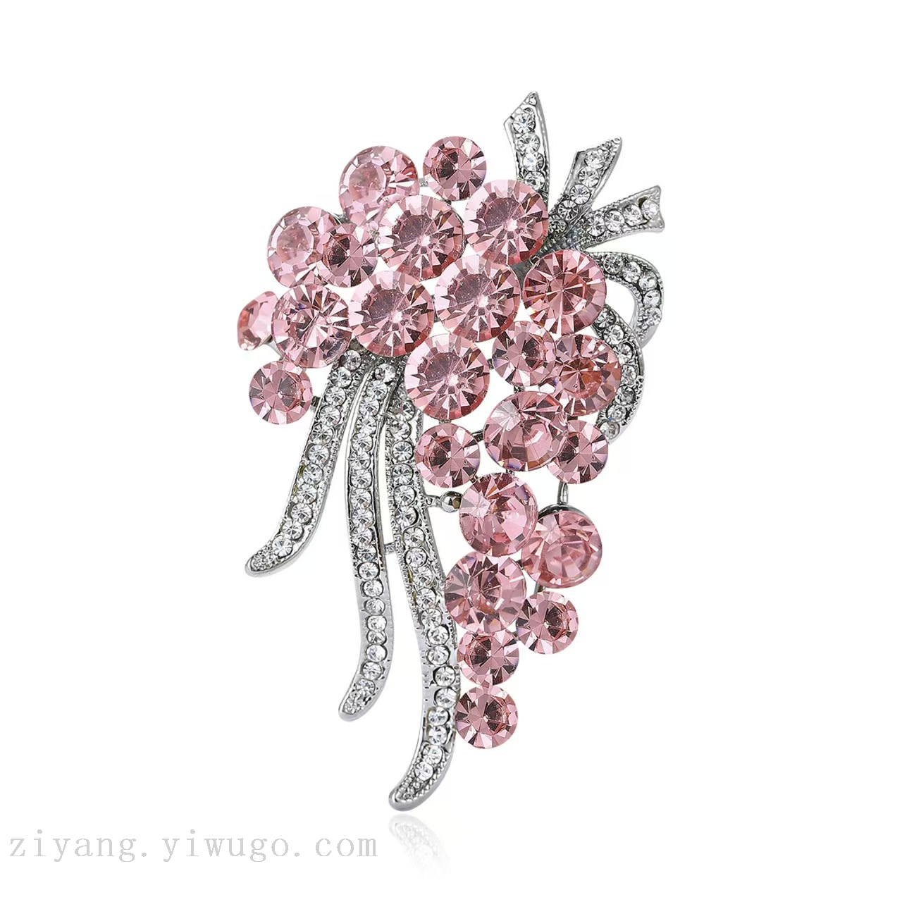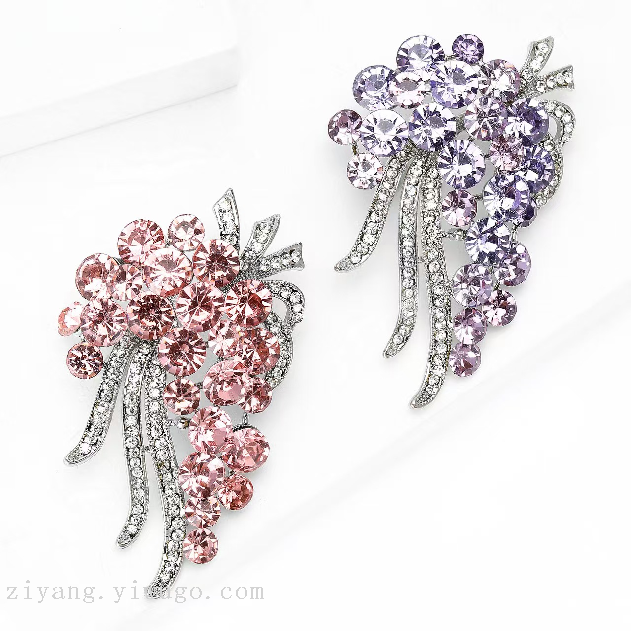 这两款水晶胸针设计精致华丽。左侧胸针以柔和粉调水晶为主,大小不一的圆形水晶簇拥成花簇状,色泽从浅粉到深粉渐变,层次丰富。金属底托上镶嵌的白色小钻,沿弯曲枝叶造型分布,如星光点缀。右侧则是梦幻紫调,水晶颜色从浅紫到深紫过渡,同样以密集排布营造出饱满花束感,银色钻饰枝叶与粉款呼应,整体线条灵动。两款胸针都以璀璨水晶和精致钻饰结合,既适合点缀优雅服饰,又能作为吸睛配饰,为造型增添华丽氛围。