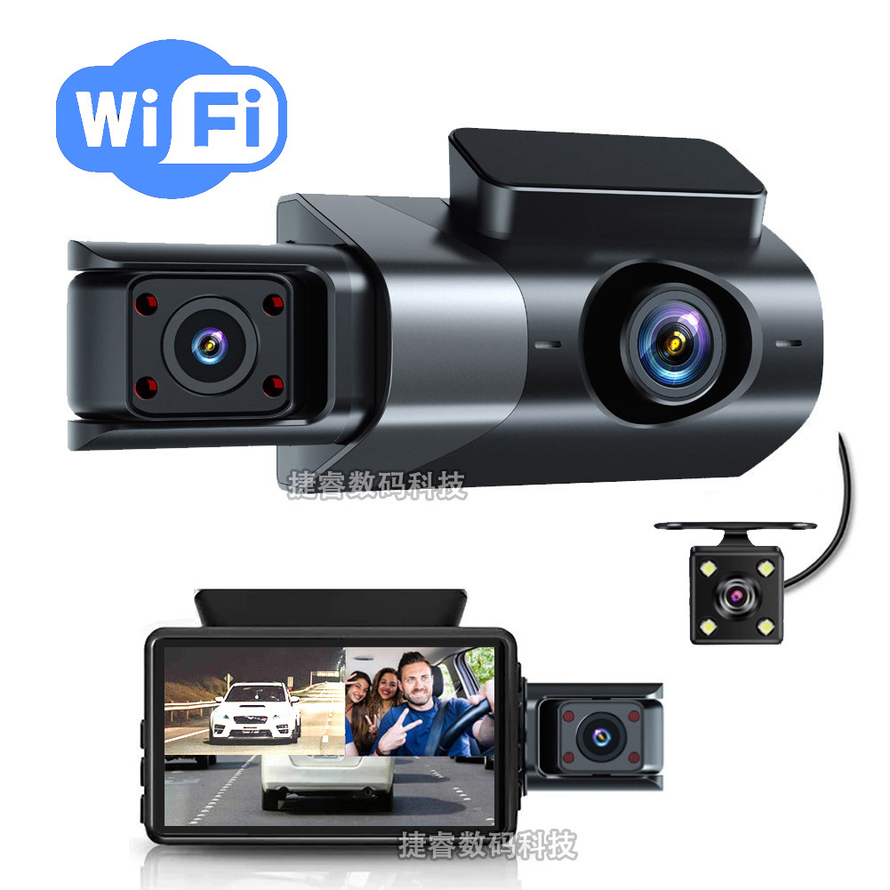 新款跨境3寸高清夜视行车记录仪WIFI三镜头三录车前内后手机互联
