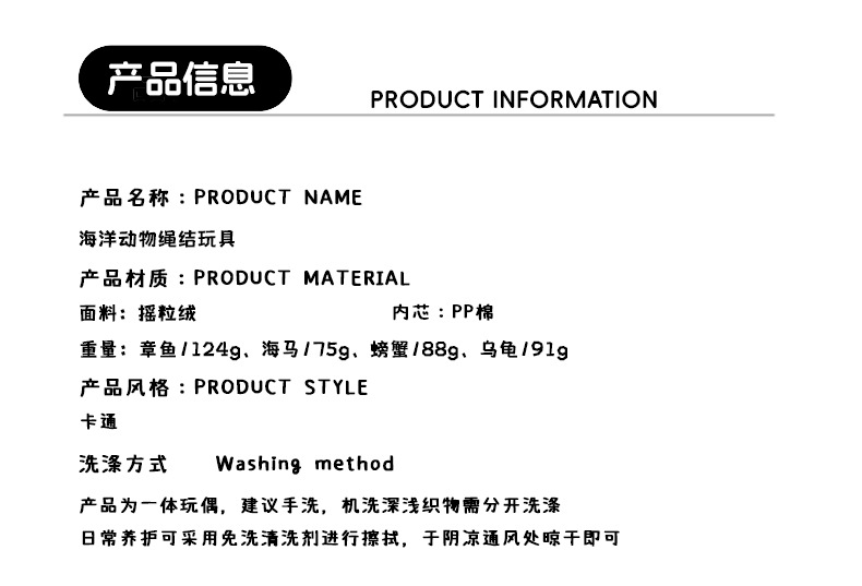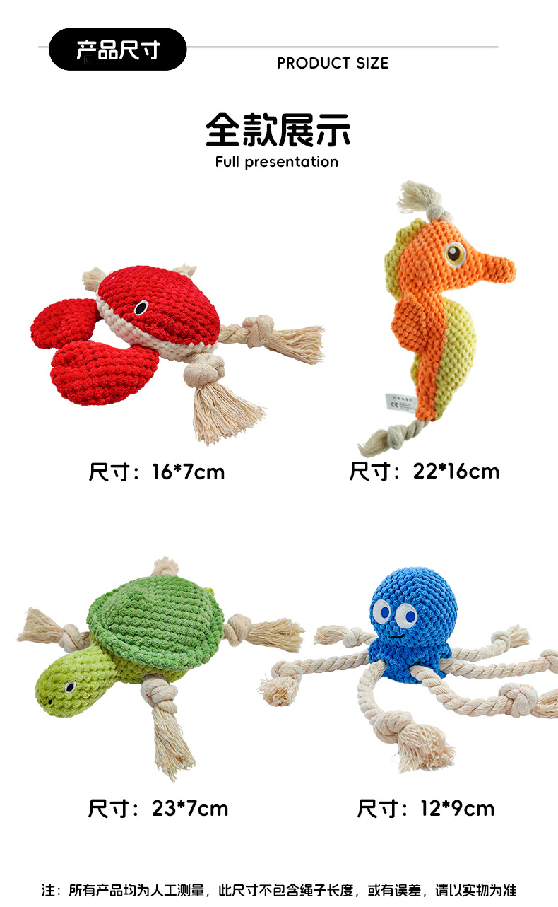 产品类别: 啃咬玩具 是否进口: 否 材质: 帆布 货号: 海洋绳结 产地: 其他 箱装数量: 180 品牌: 群泽 是否专利货源: 否 颜色: 章鱼绳结(单款500起定),螃蟹绳结(单 是否跨境出口专供货源: 否 重量: 0.02 kg/个