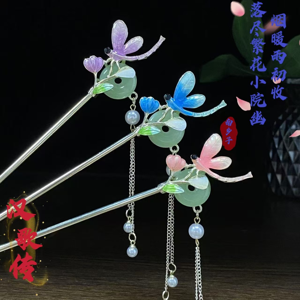 材质: 合金 风格: 古风 货号: 新中式彩绘蜻蜓发簪 品牌: 汉歌传 造型: 蜻蜓 处理工艺: 电镀 适用送礼场合: 婚庆,生日,旅游纪念,节日,乔迁,展销会 包装: 独立包装 加工定制: 是 销售序列号: 古风平安扣蜻蜓发簪 生产编号: 蜻蜓发簪 产地: 义乌 主要下游平台: 淘宝,快手,天猫,拼多多,抖音 颜色: 发簪0593,发簪0592,发簪0591 是否跨境出口专供货源: 否 上市年份/季节: 2025年春季 流行元素: 发簪 重量: 0.05 kg/个