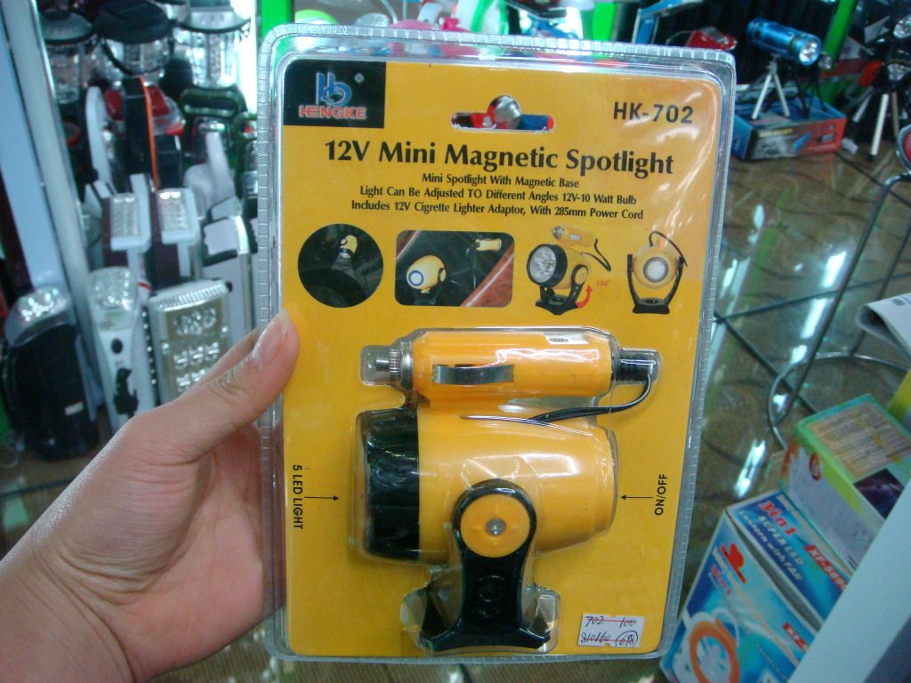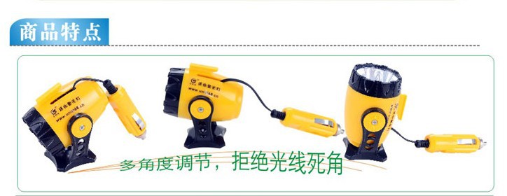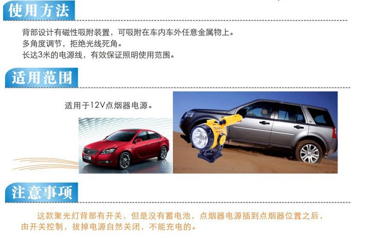 可直接插入汽车点烟器座上使用,灯内置电线长3米,可照明汽车各个部位。头部为旋转式内可卷入电线,灯体与底部支架可旋转调节,尾部带有警示功能和磁铁可附吸车上方便使用,是各类车辆应急必备之品。
