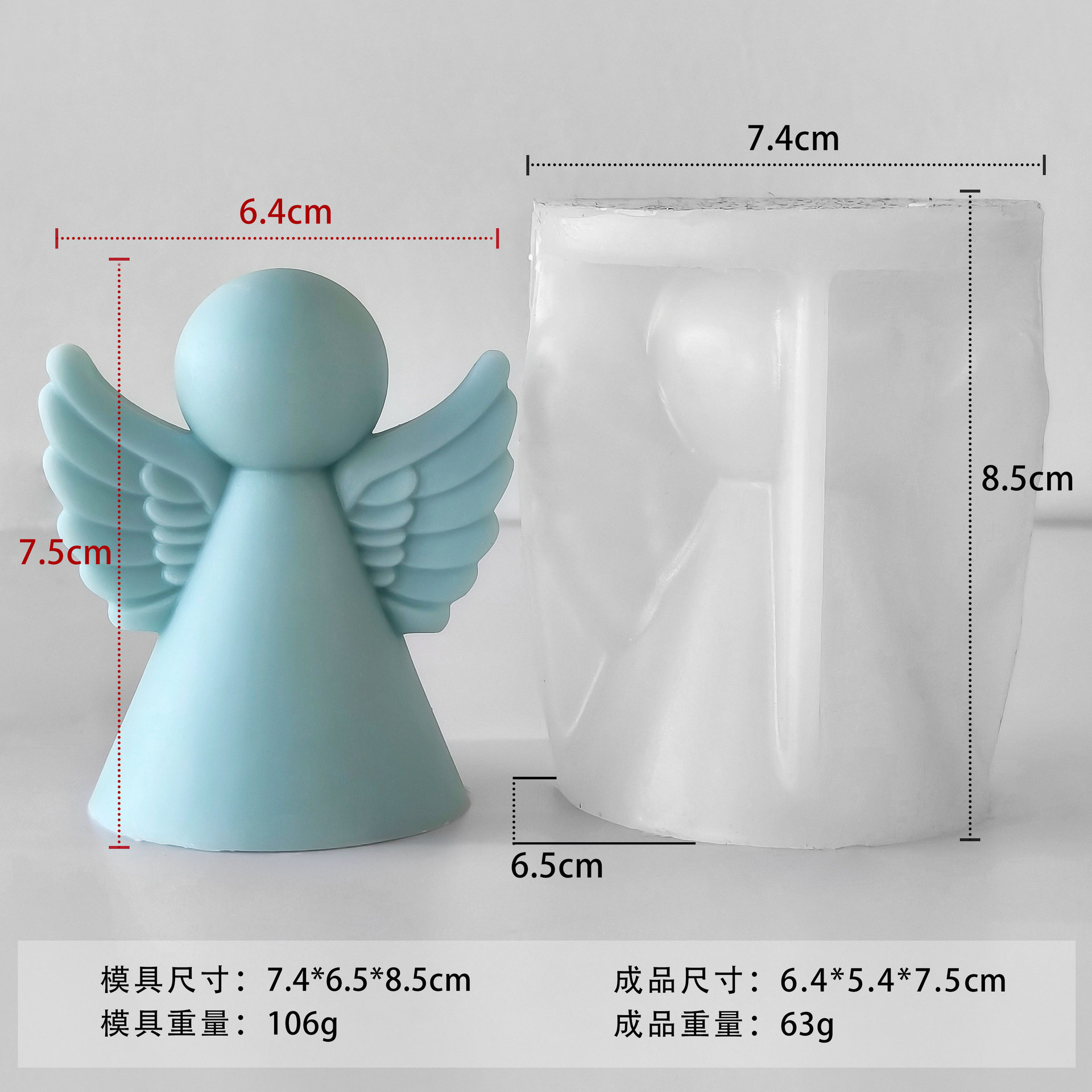 品牌: 嘉汇美 是否进口: 否 产品类别: 蛋糕模 形状: 不规则形 材质: 硅胶 货号: J-5399 包装规格: opp 产品上市时间: 2025 价格段: 5-10元 是否有专利: 否 用途: 香薰 蜡烛 规格: 天使模具J-5399,天使模具J-067 有可授权的自有品牌: 否 是否跨境出口专供货源: 否 风格: 现代简约 产品颜色: 白色 产品规格: 天使模具 版权: 无