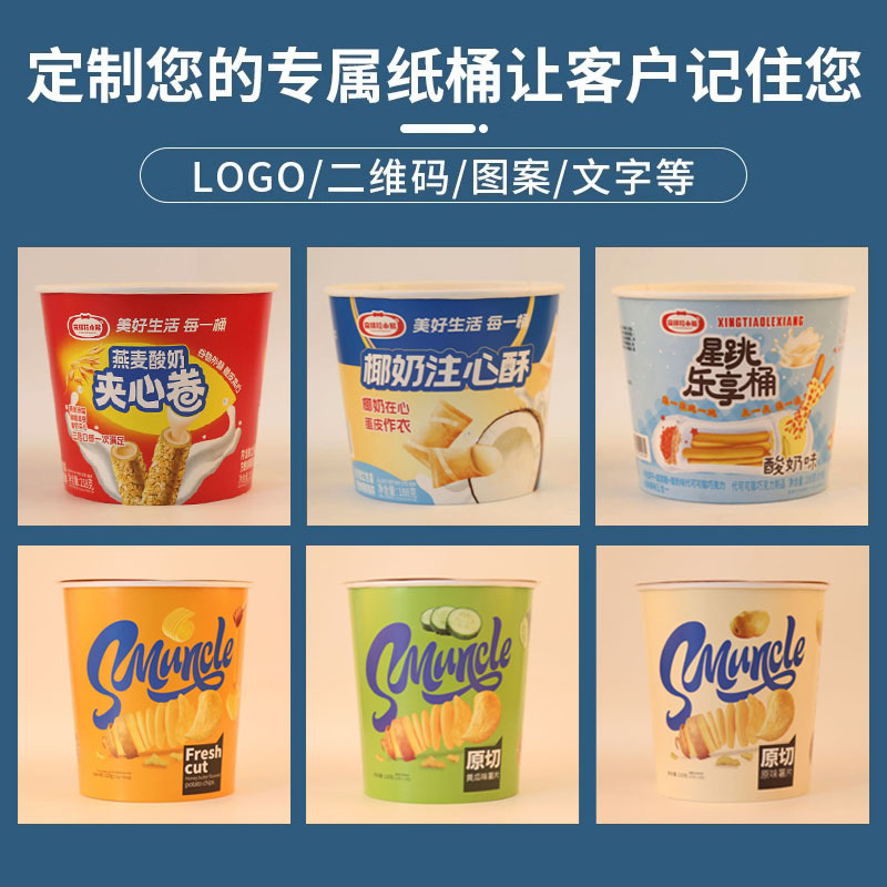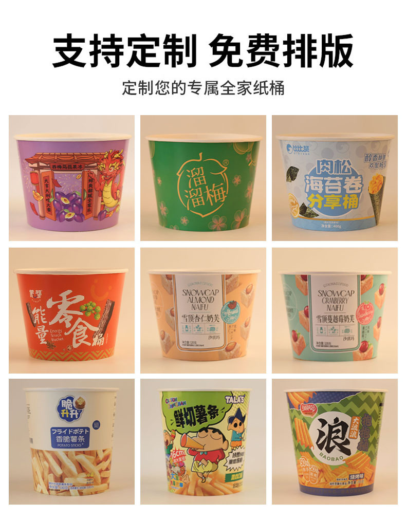 一次性零食桶定 制食品小吃桶空桶圆桶打包桶带盖纸桶定 做印logo English | 投诉