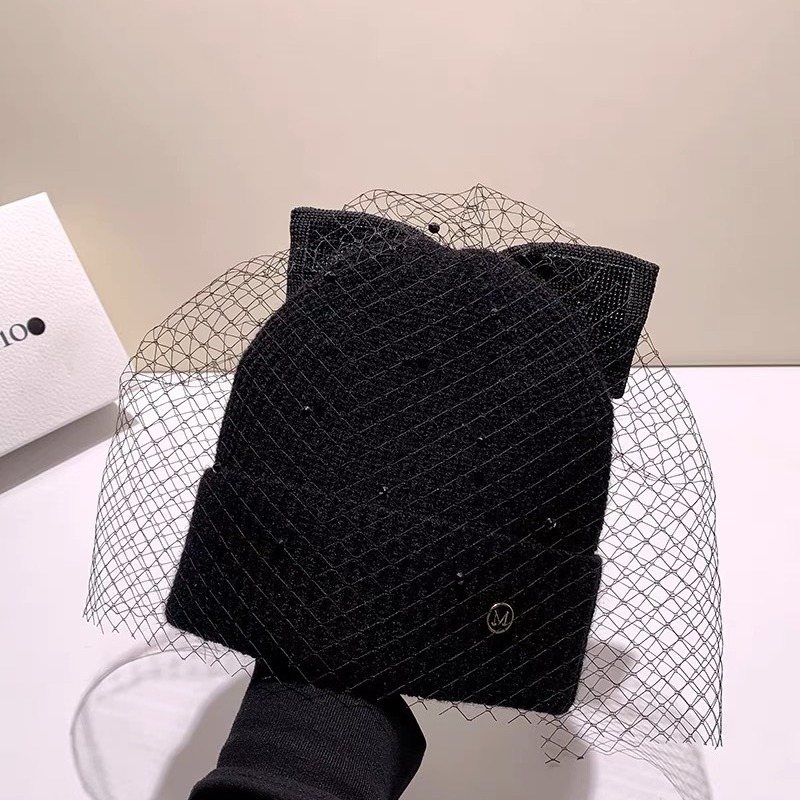 黑色蝴蝶结网纱毛线帽子女秋冬季新款韩版百搭甜美可爱保暖针织帽