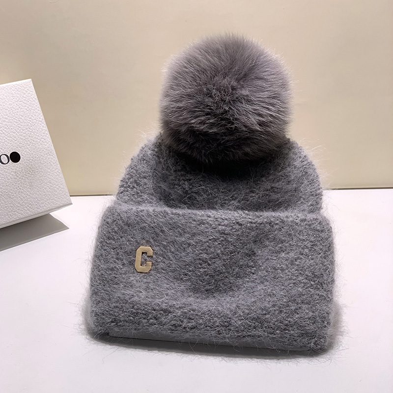 真狐狸毛球冬季保暖兔毛针织帽女秋冬韩版百搭帽子护耳圆顶毛线帽