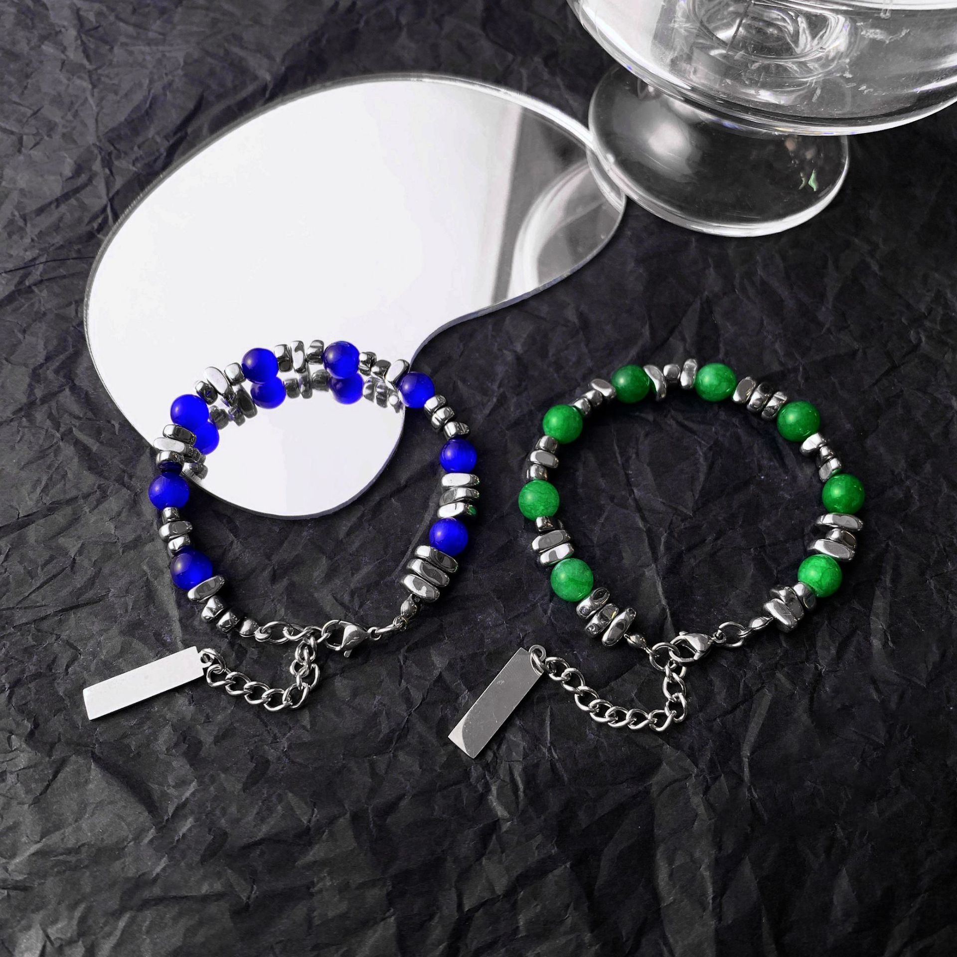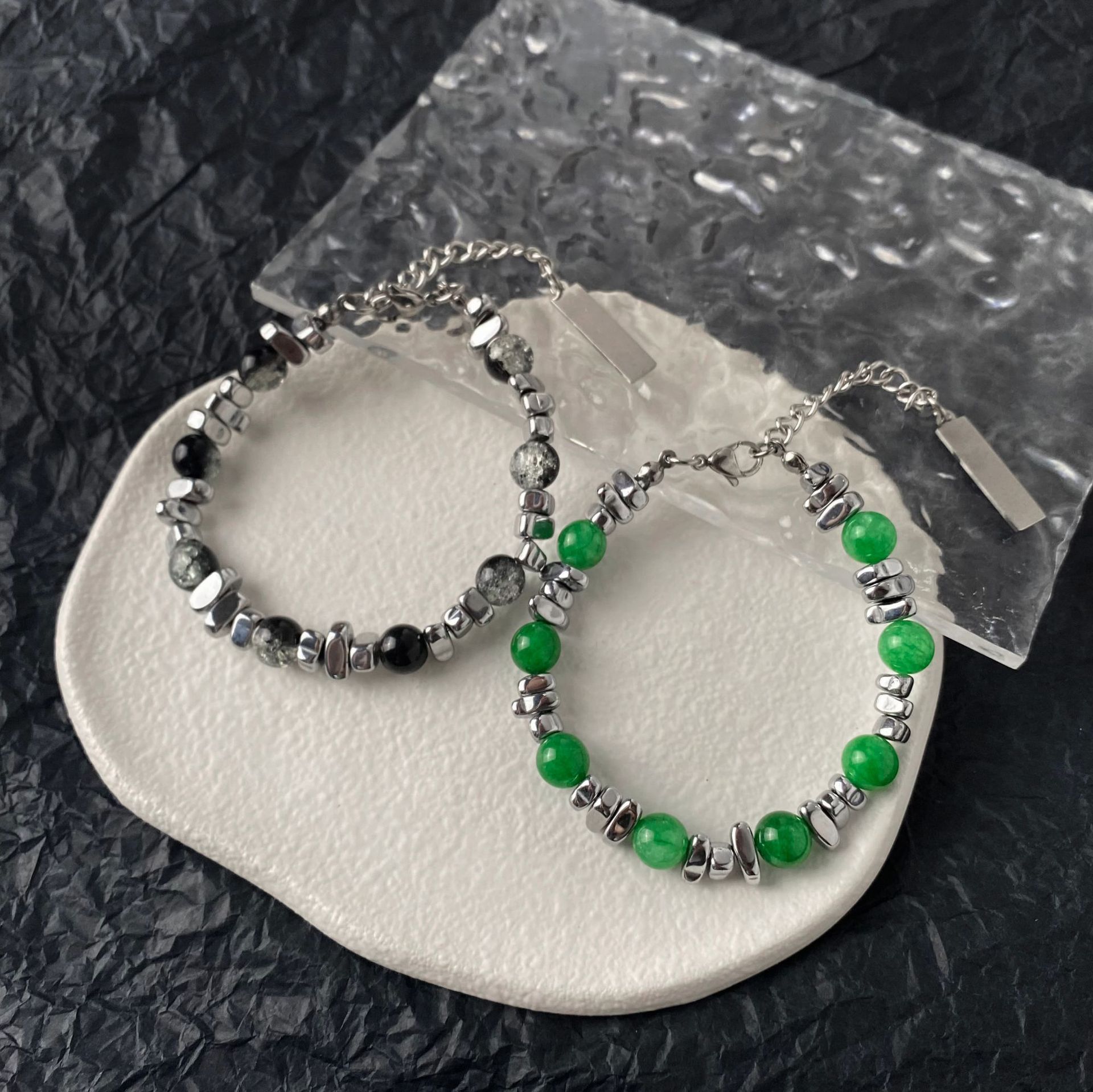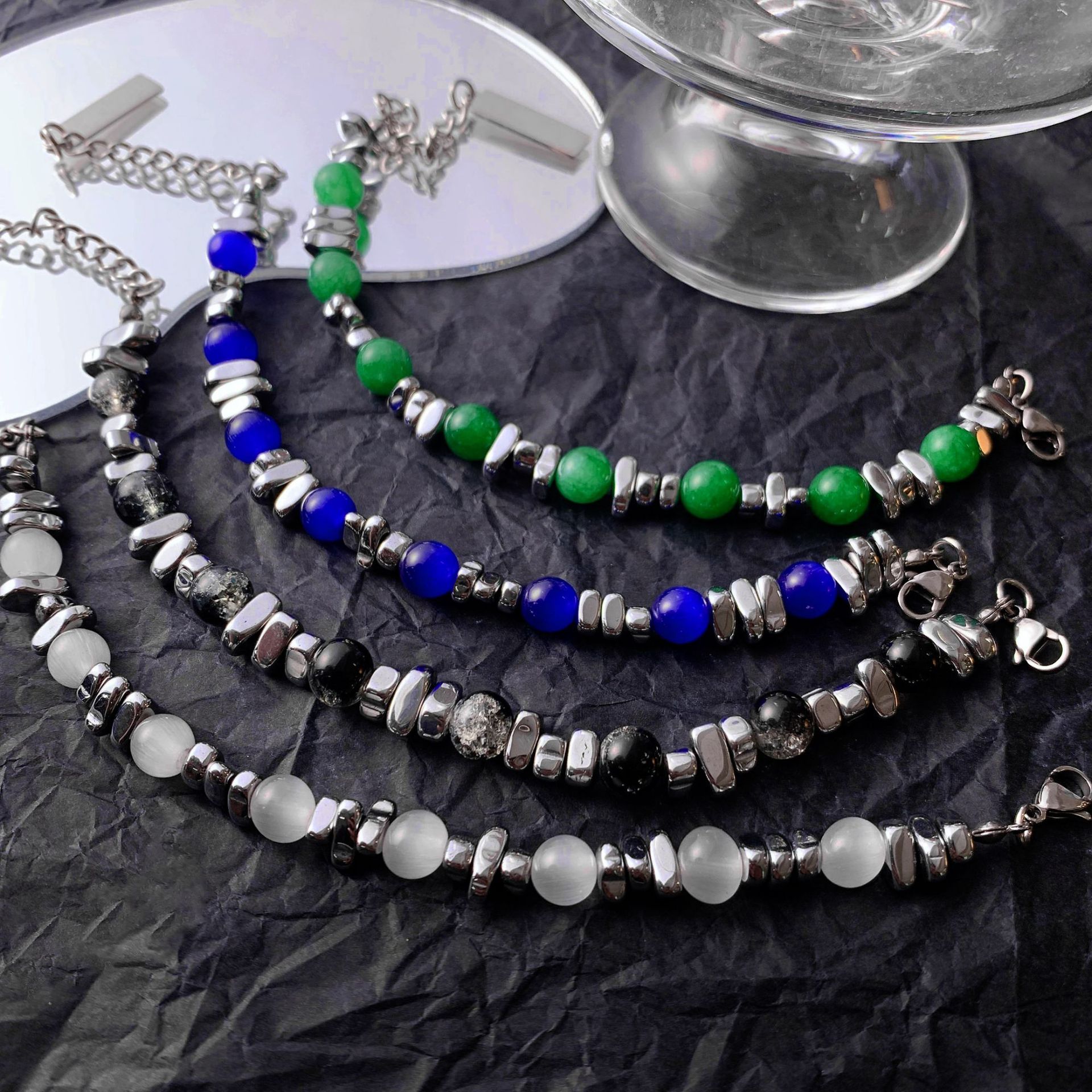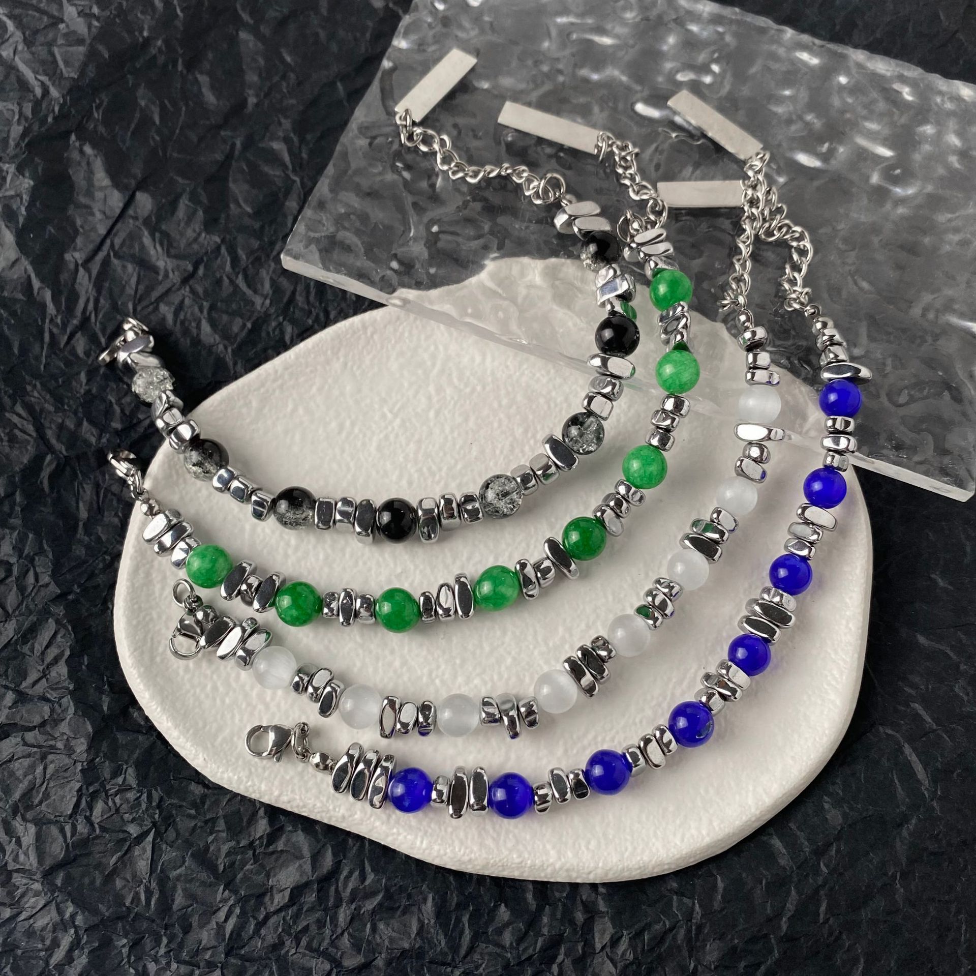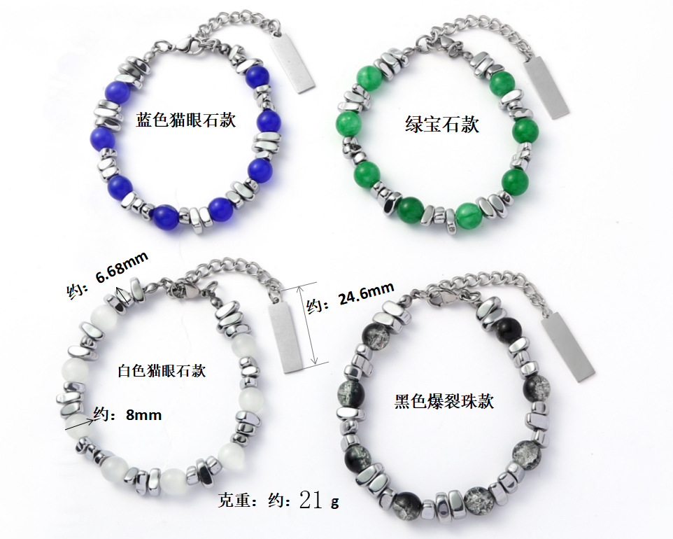 现批小众设计感猫眼石手串拼接INS潮手饰钛钢黑曜石多色男女手链 English | 投诉