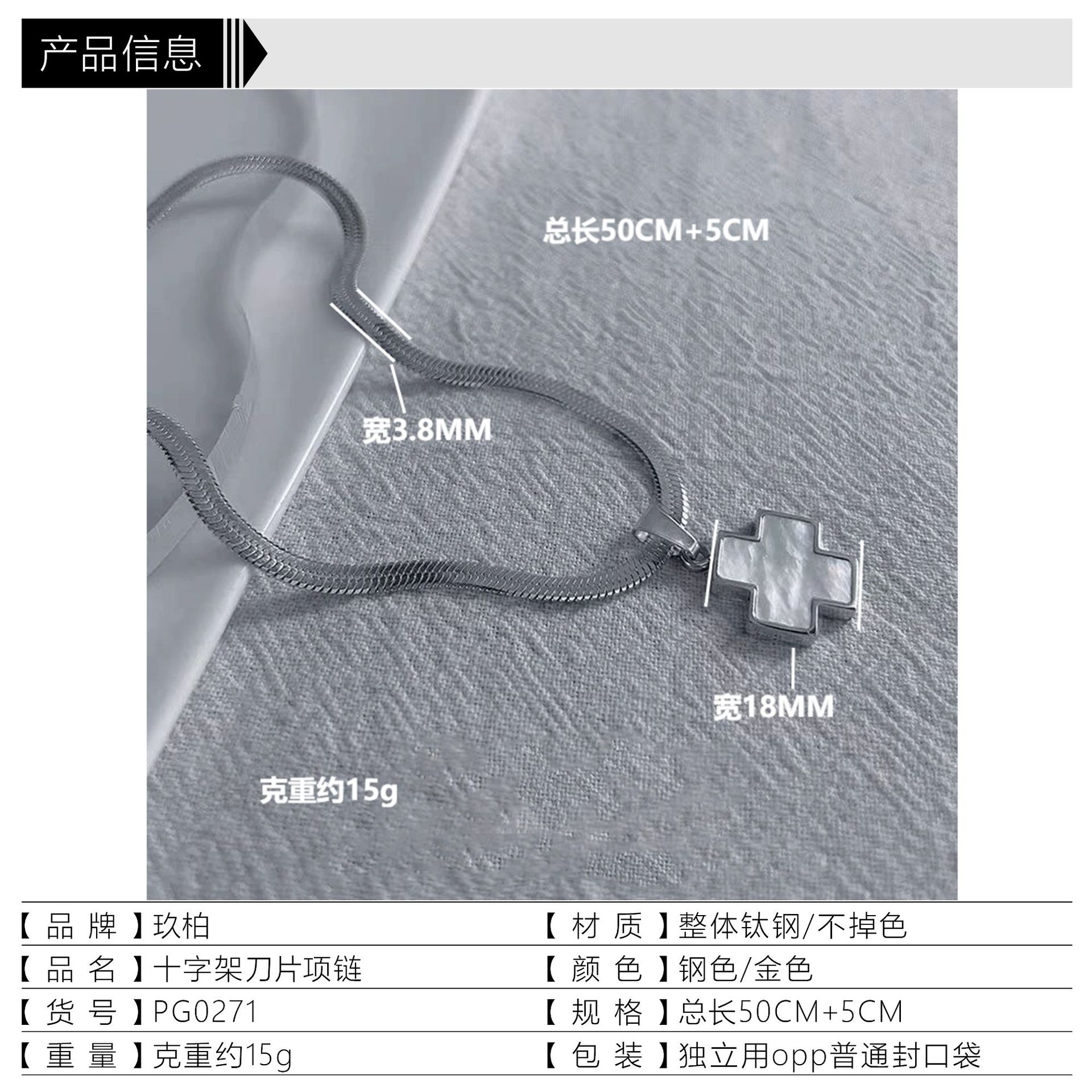 材质: 钛钢 处理工艺: 抛光 品牌: 玖柏 造型: 几何型 货号: PG0271 产地: 东莞 链子样式: 刀片链 是否多层: 否 坠子材质: 钛钢 周长: 51cm(含)-60cm(含) 主要下游平台: 淘宝,京东,ebay,PDD,亚马逊,w 颜色: 钢色彩贝母十字架项链,金色彩贝母十字架项 有可授权的自有品牌: 否 是否跨境出口专供货源: 否 流行元素: 十字架,链条 上市年份/季节: 2024年冬季 风格: 简约 重量: 14克 风格分类: 时尚通勤 适用人群: 男女通用