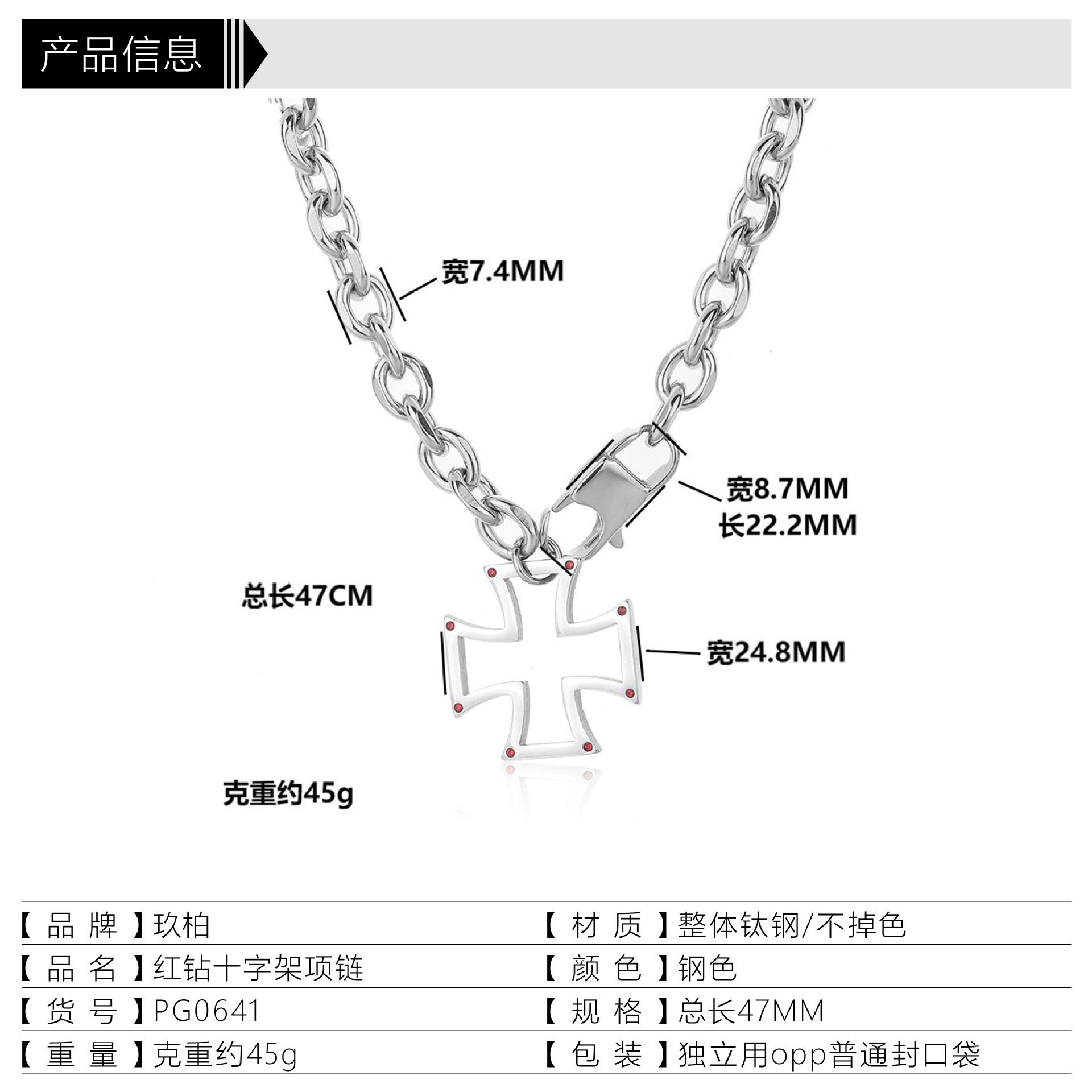 材质: 钛钢 处理工艺: 镶钻 品牌: 玖柏 造型: 几何型 货号: PG0641 产地: 东莞 链子样式: o字链 是否多层: 否 坠子材质: 钛钢 周长: 51cm(含)-60cm(含) 主要下游平台: 淘宝,京东,ebay,PDD,亚马逊,w 颜色: 项链 有可授权的自有品牌: 是 是否跨境出口专供货源: 是 流行元素: 波点,线条,六边形,四边形 上市年份/季节: 2024年冬季 风格: 欧美 风格分类: 时尚通勤 主要销售地区: 非洲,欧洲,南美,东南亚,北美,东北亚, 适用人群: 男女通用