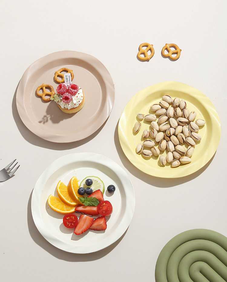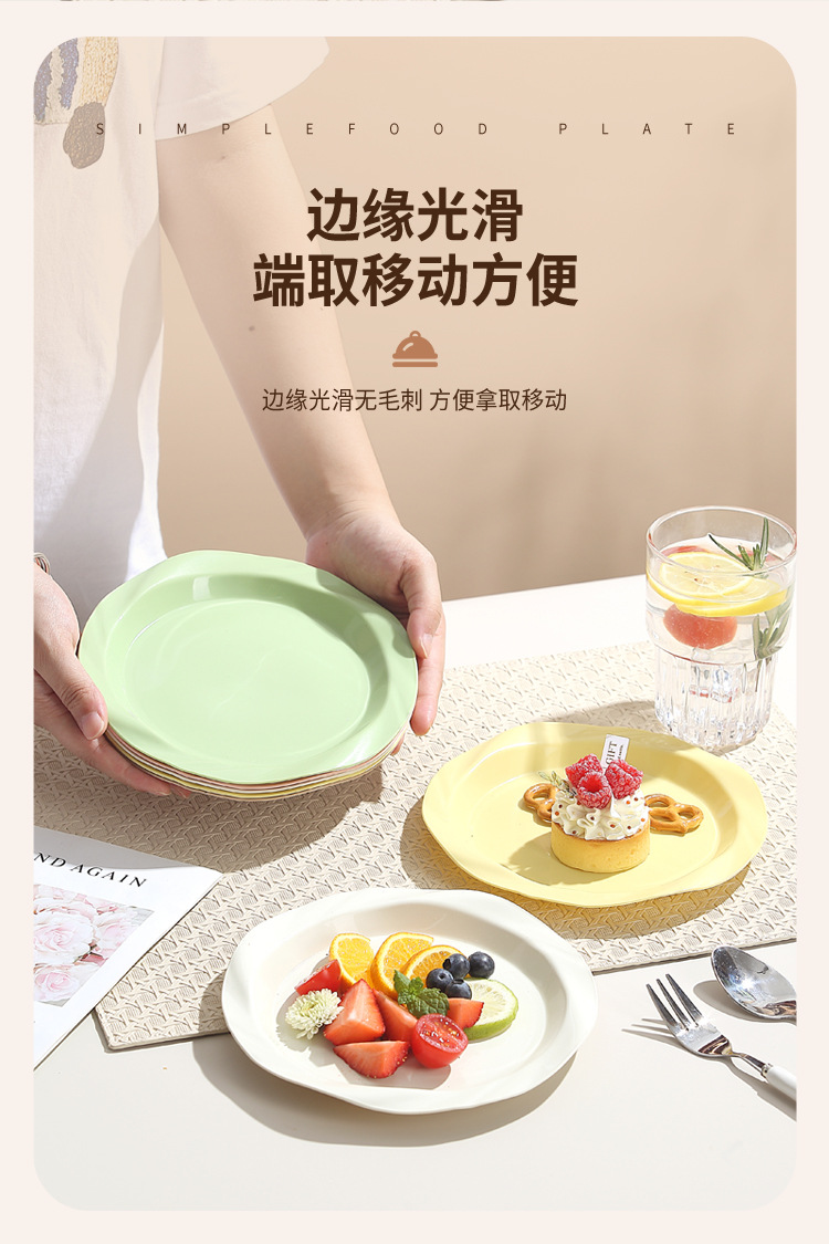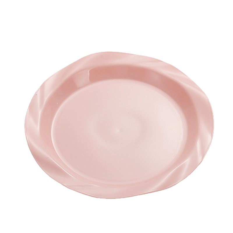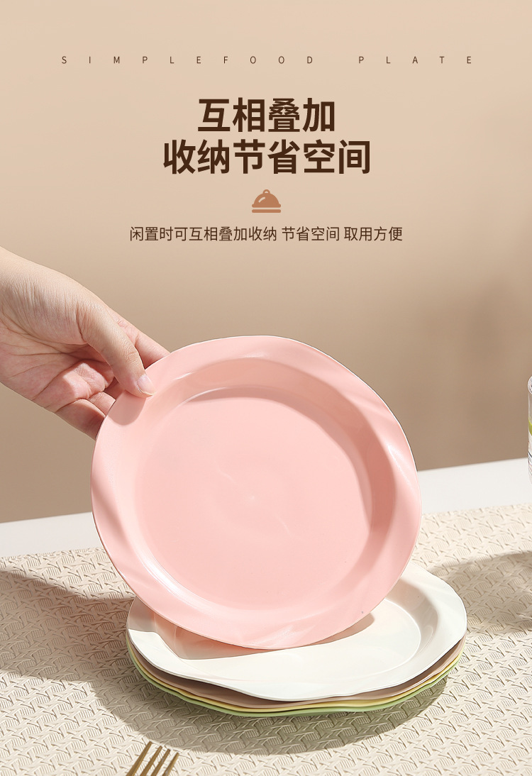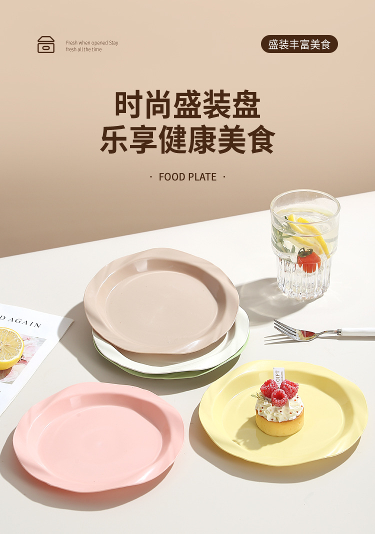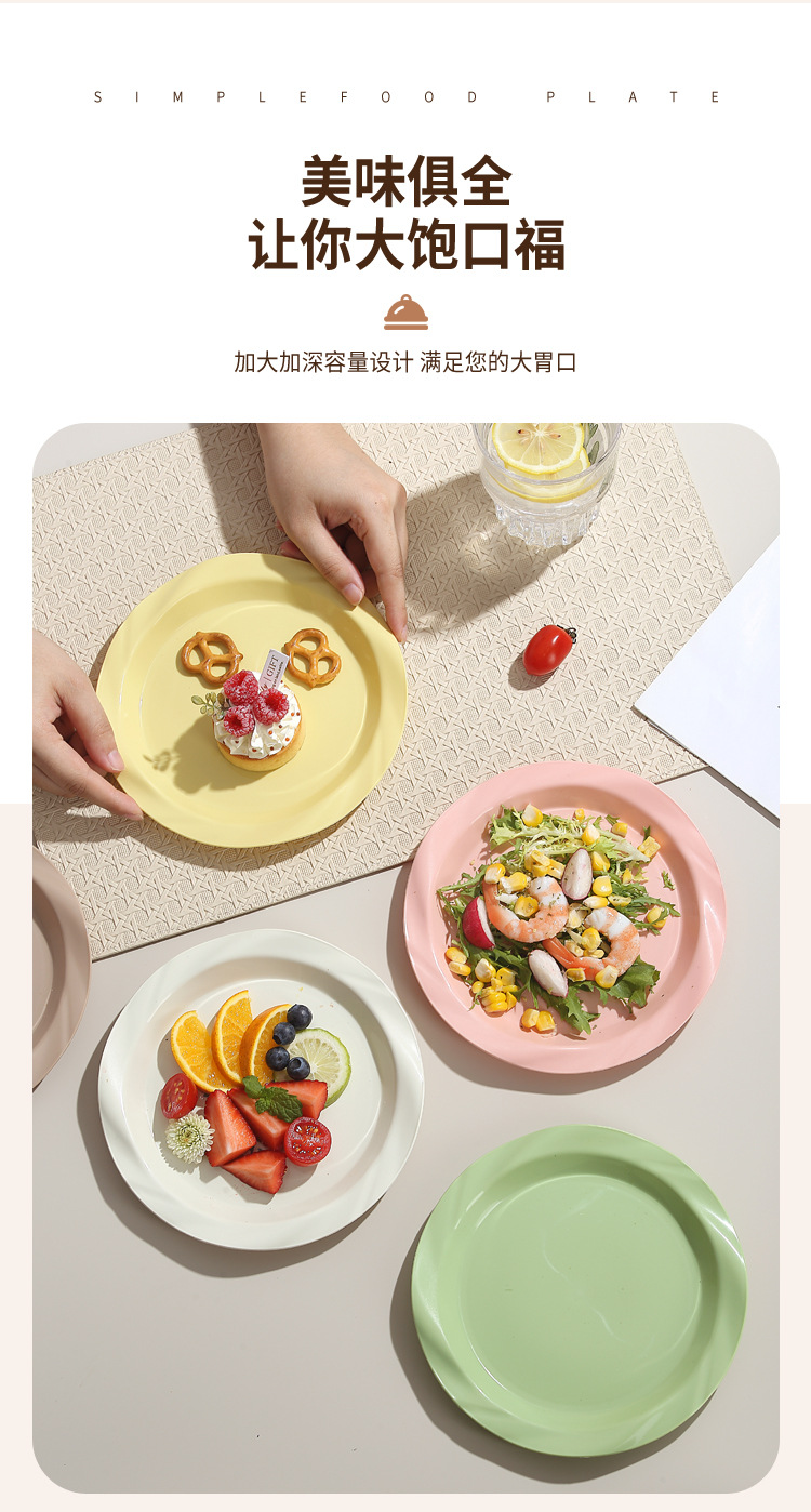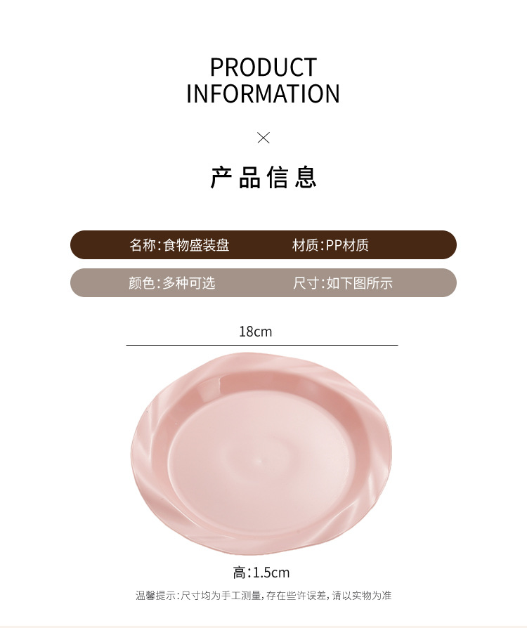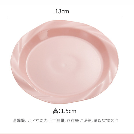品牌: 其它 产品类别: 盘 材质: 塑料 是否进口: 否 适用人群: 通用 图案: 纯色 风格: 现代简约 形状: 圆形 微波炉: 不可用 适用场景: 酒店,饭菜,喝咖啡 适用送礼场合: 商务礼品,节日,促销赠品 加印LOGO: 可以 加工定制: 可以 产品上市时间: 2024 价格段: 5元以内 适用对象: 通用 表面工艺: 色釉 是否有专利: 否 颜色: 米白色,乳白色,樱花粉,薄荷绿,米黄色 直径: 18-18.9cm 重量: 0.354 kg/个
