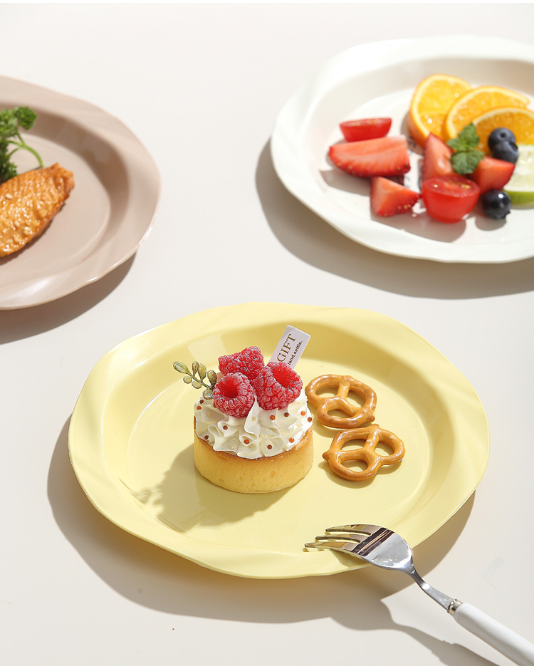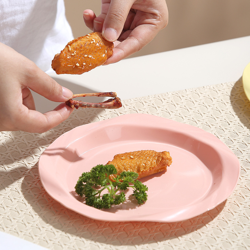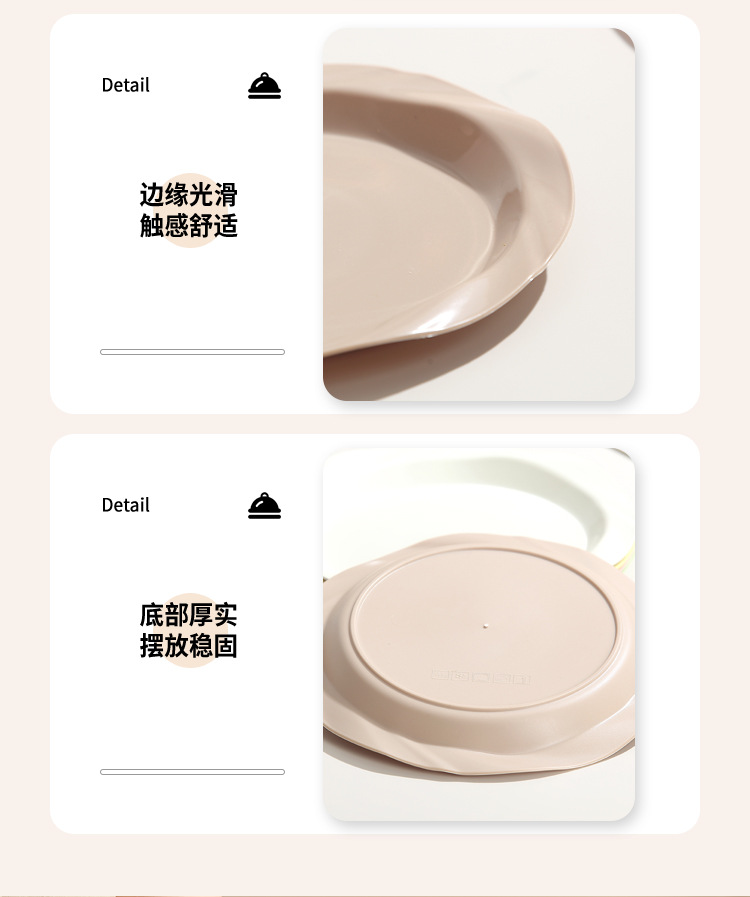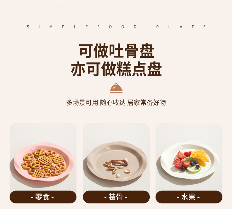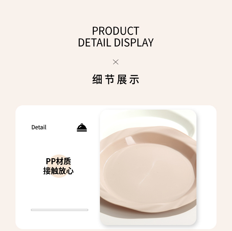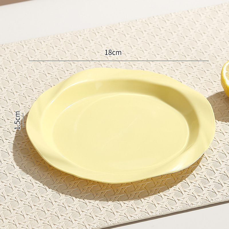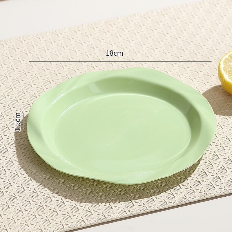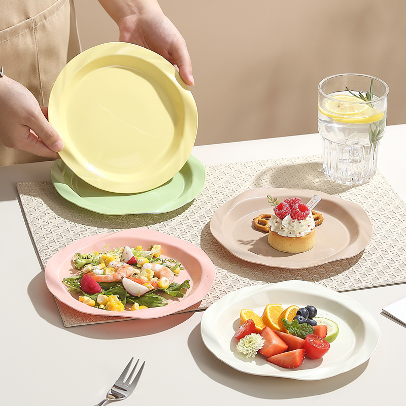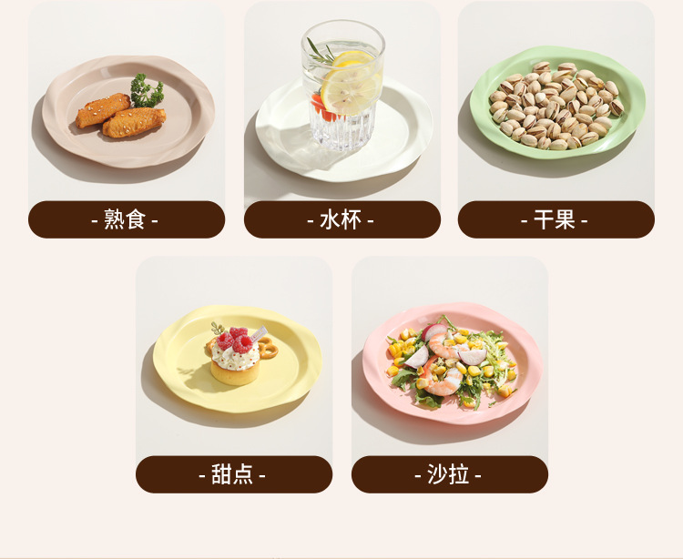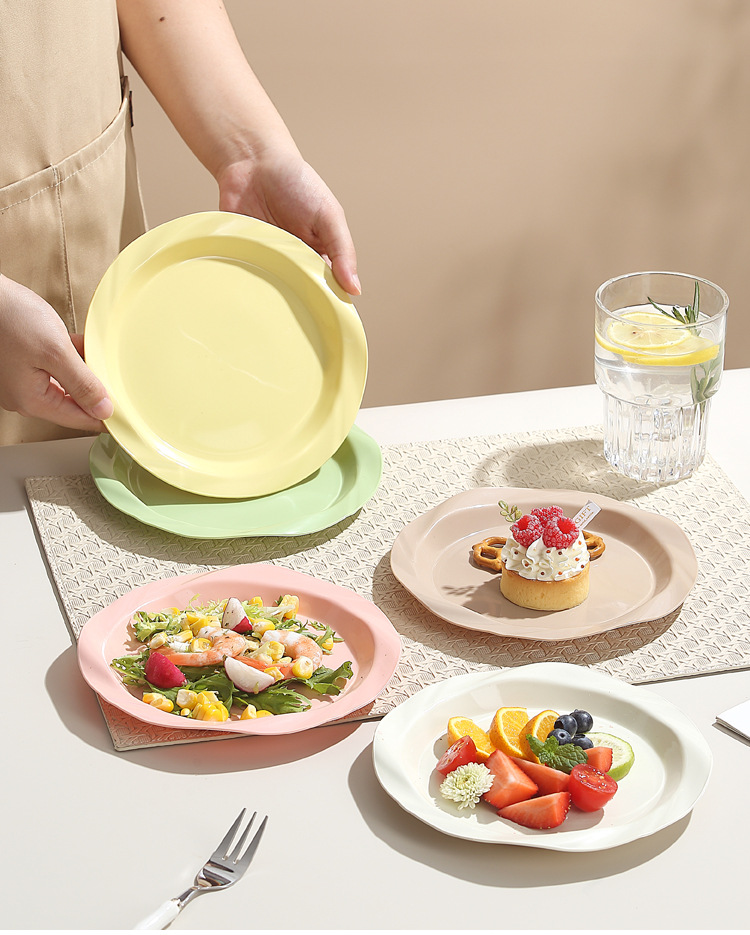 品牌: 其它 产品类别: 盘 材质: 塑料 是否进口: 否 适用人群: 通用 图案: 纯色 风格: 现代简约 形状: 圆形 微波炉: 不可用 适用场景: 酒店,饭菜,喝咖啡 适用送礼场合: 商务礼品,节日,促销赠品 加印LOGO: 可以 加工定制: 可以 产品上市时间: 2024 价格段: 5元以内 适用对象: 通用 表面工艺: 色釉 是否有专利: 否 颜色: 米白色,乳白色,樱花粉,薄荷绿,米黄色 直径: 18-18.9cm 重量: 0.354 kg/个