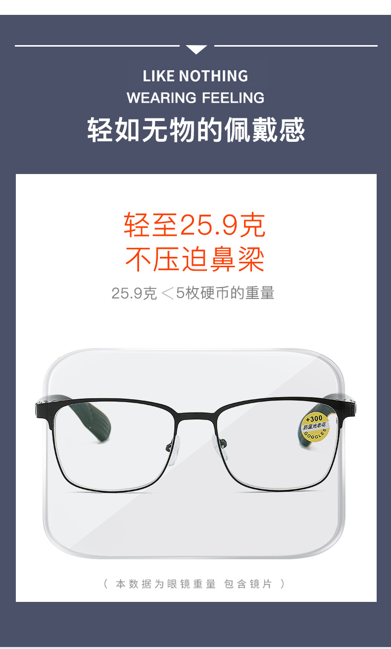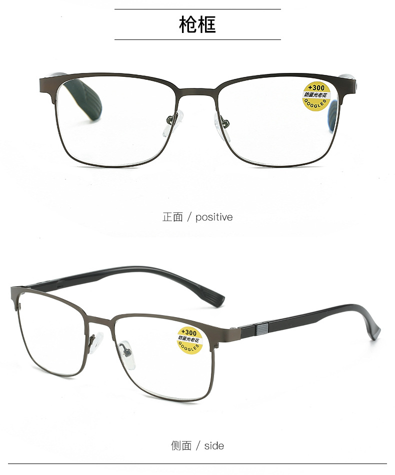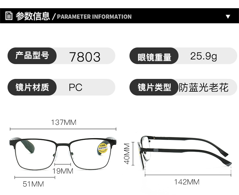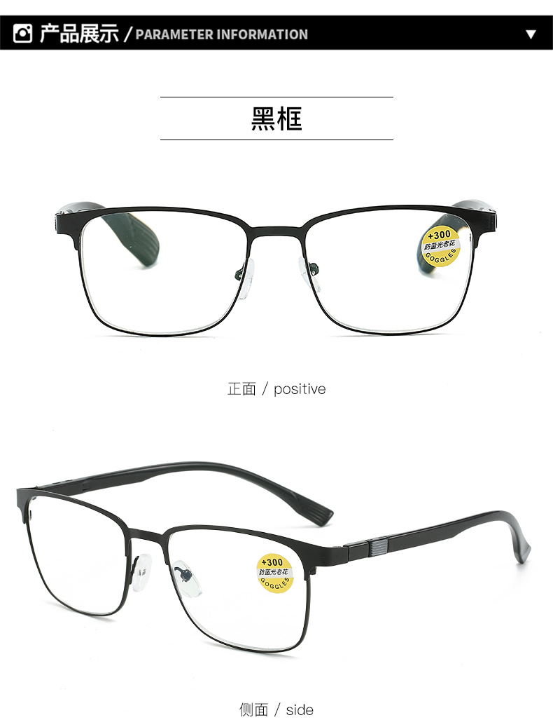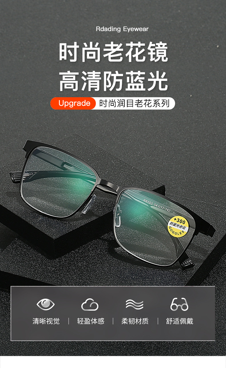 镜片材质: 亚克力 镜片功能: 抗紫外线 上市年份/季节: 2024年夏季 产品类别: 老花镜 货号: 8103 是否跨境出口专供货源: 是 镜框颜色: 枪灰,亮黑 度数: 100,150,200,250,300, 眼镜结构: 全框架 是否支持近视镜: 否 重量: 0.025 kg/副
