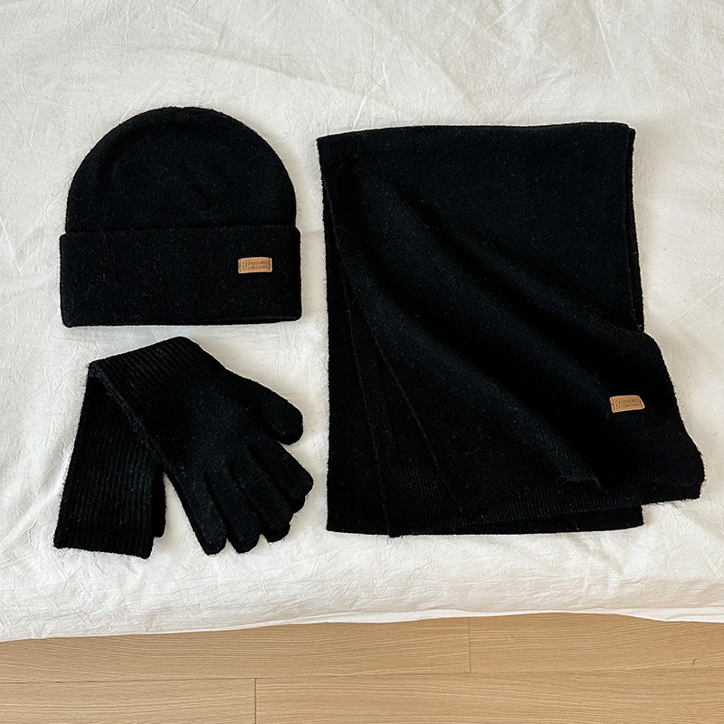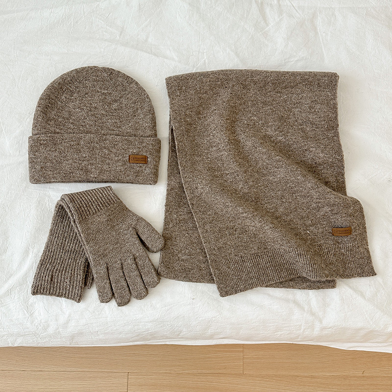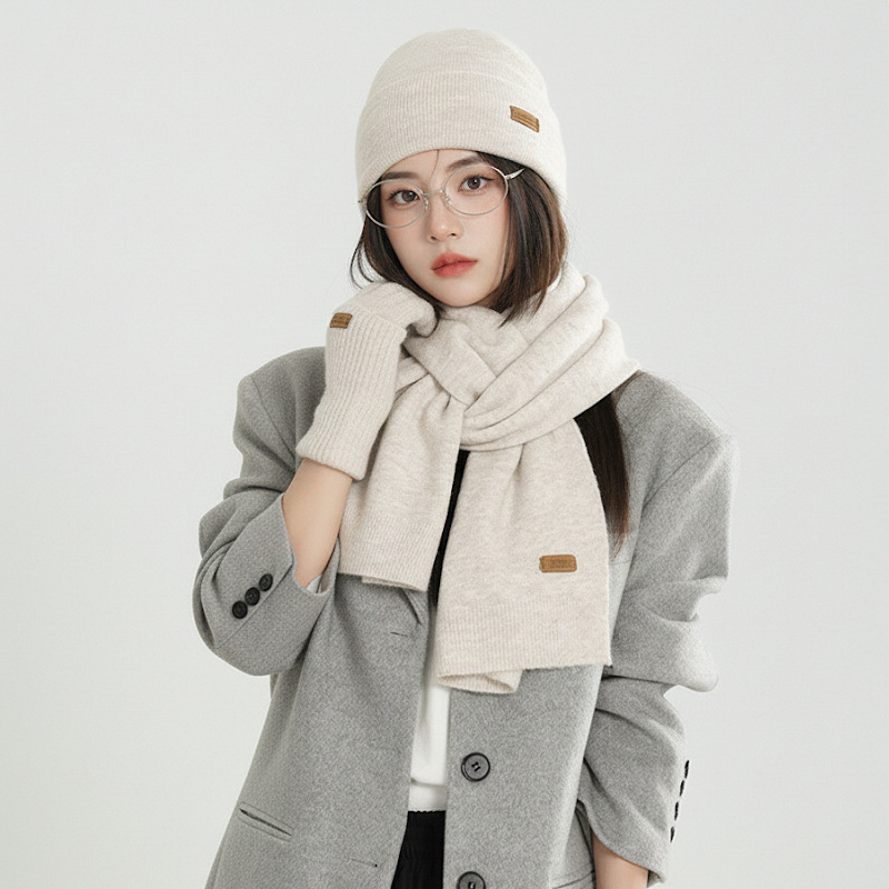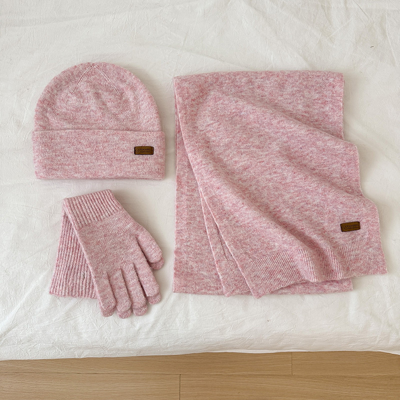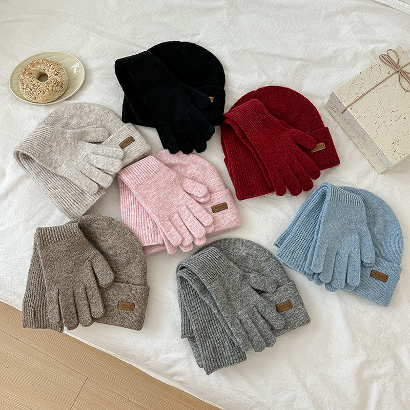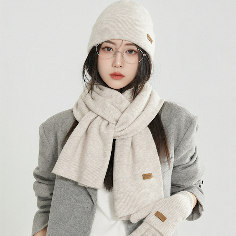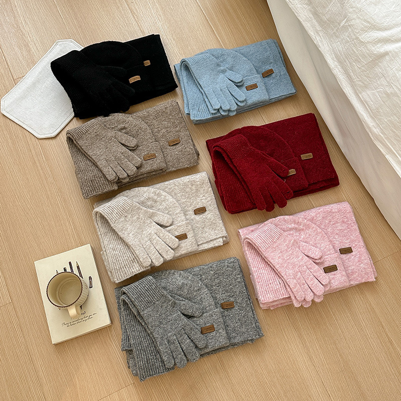 纯色针织围巾女冬季2025新款韩版百搭加厚保暖帽子手套围脖三件套