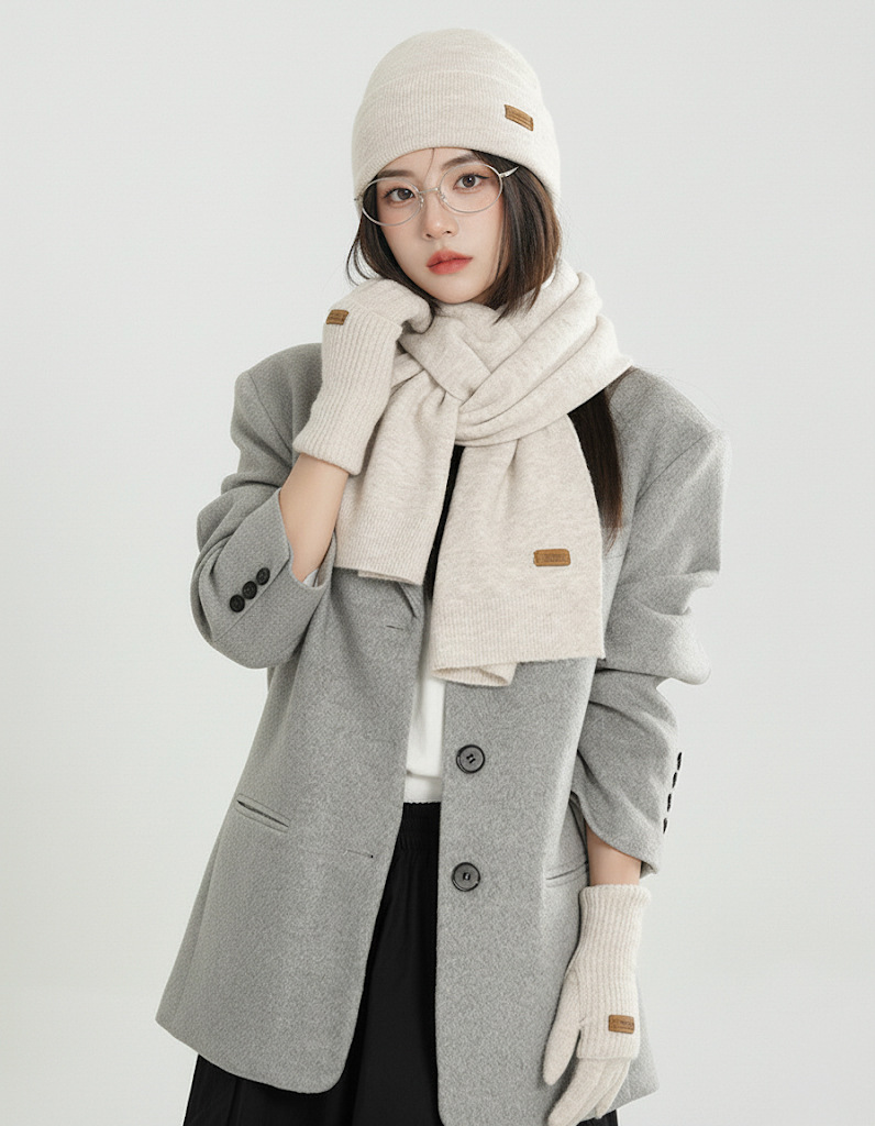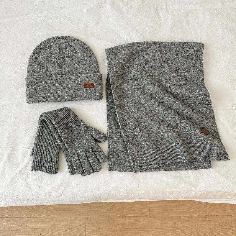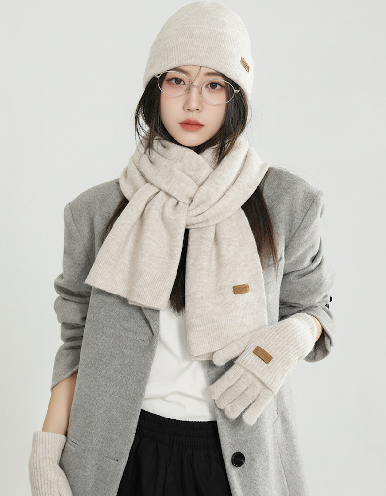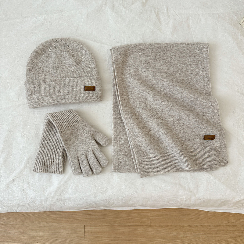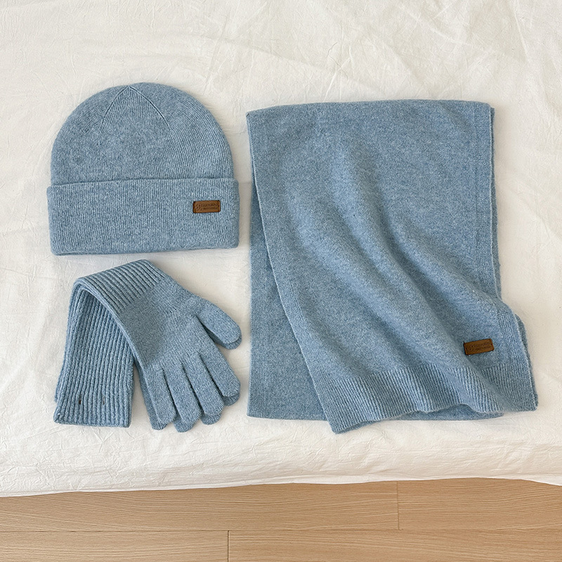 纯色针织围巾女冬季2025新款韩版百搭加厚保暖帽子手套围脖三件套