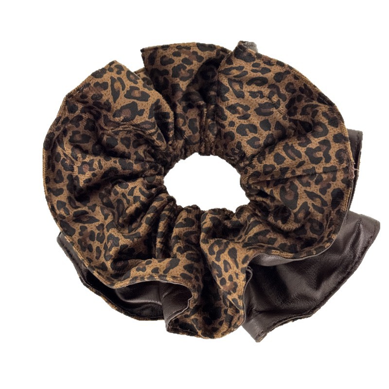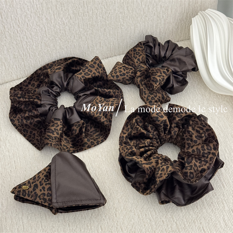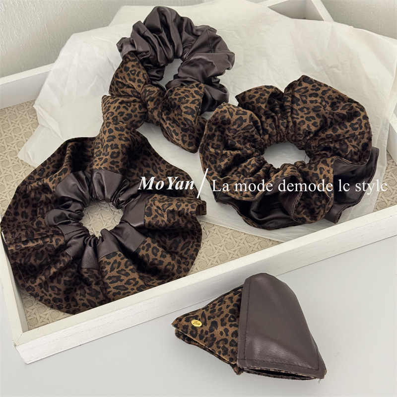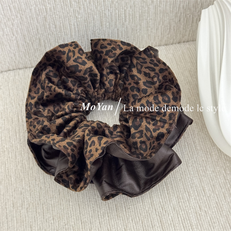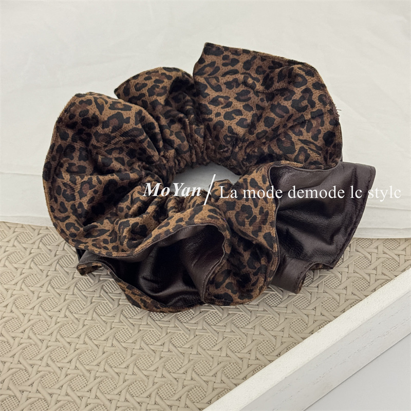 高级感复古麂皮绒豹纹PU拼接大肠发圈女韩系百搭慵懒风头绳女抓夹