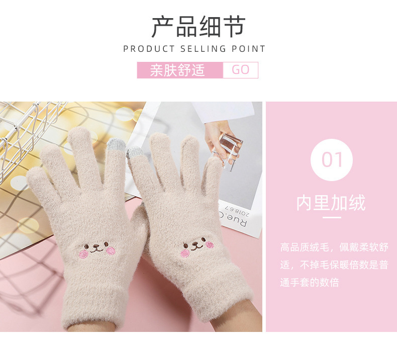品牌: 其他 材质: 水貂绒 功能: 触屏 货号: ys-D-10 款式: 分指手套 颜色: 笑脸白色,笑脸卡其,笑脸粉色 有可授权的自有品牌: 否 是否跨境出口专供货源: 否 适合季节: 冬季 适用对象: 通用 上市年份/季节: 2025年秋季 产地: 浙江 风格: 可爱 面料名称: 仿貂绒 风格分类: 清新甜美 处理工艺: 提花 产品类别: 保暖手套 流行元素分类: 动物 重量: 0.1 kg/双