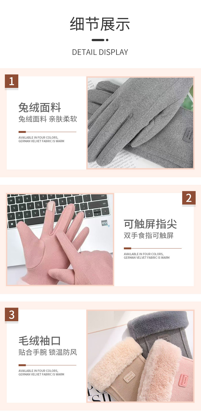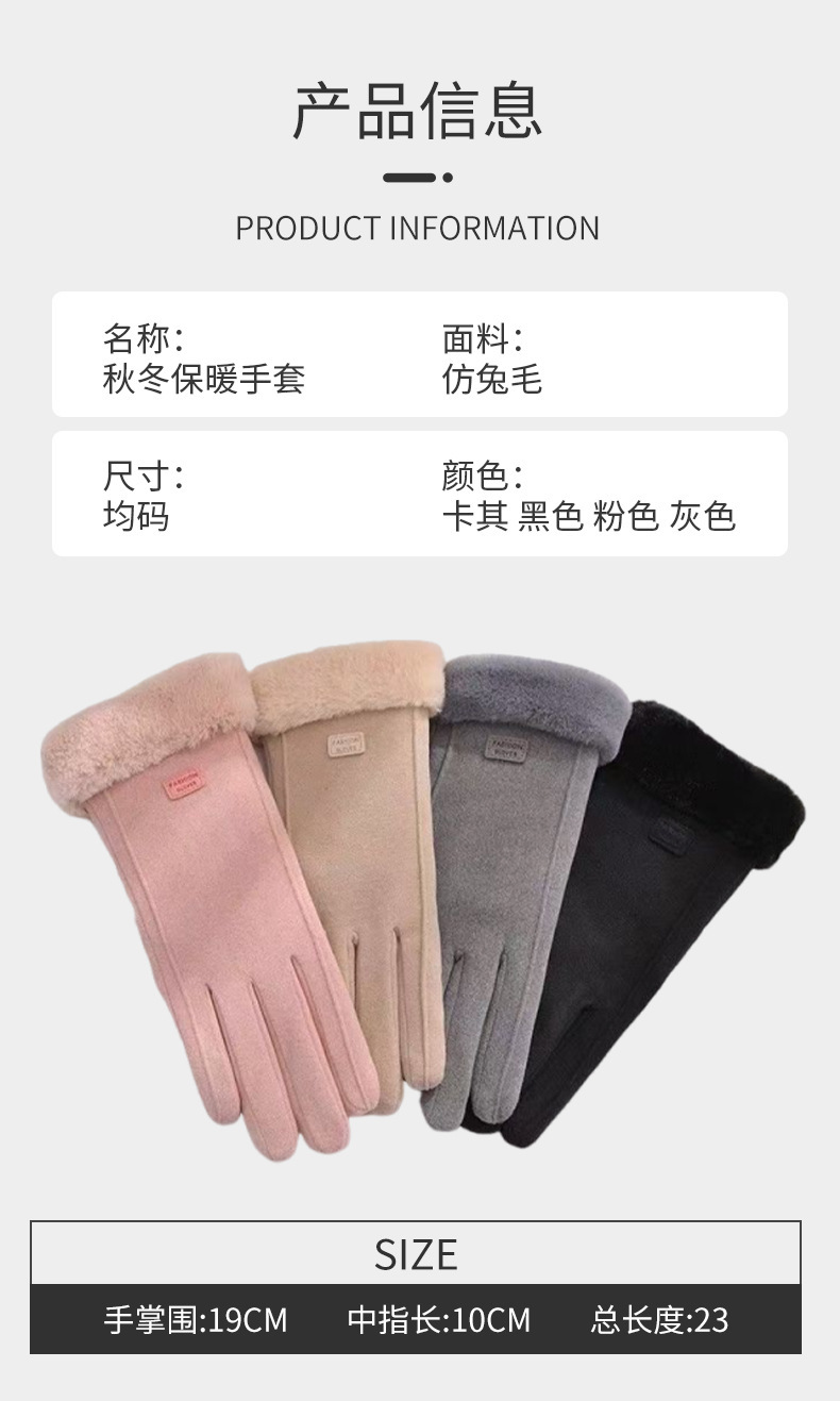 品牌: 其它 功能: 防滑,触屏 货号: 5B42iFcB 款式: 连指手套 颜色: 卡其色,黑色,灰色,粉色 尺码: 均码 有可授权的自有品牌: 否 是否跨境出口专供货源: 否 适合季节: 冬季 上市年份/季节: 2025年秋季 产地: 金华 风格: 日韩,淑女,甜美,韩版韩式,仙女风 面料名称: 仿兔绒 风格分类: 清新甜美 处理工艺: 印花,提花,压花 产品类别: 保暖手套 流行元素分类: 生活用品,字母/数字/文字,形状/图案 重量: 0.1 kg/双