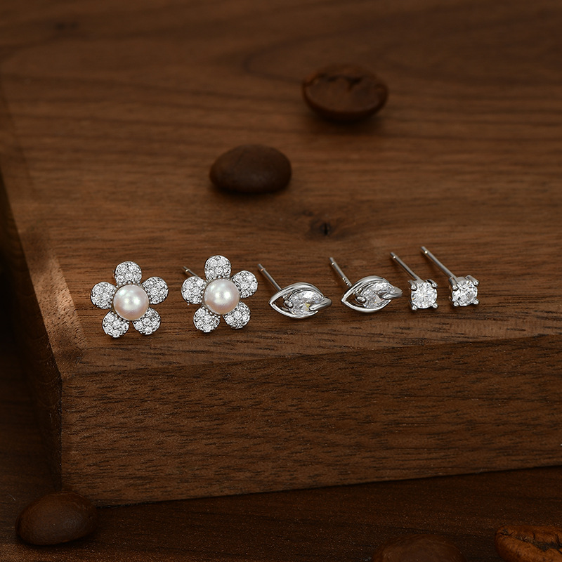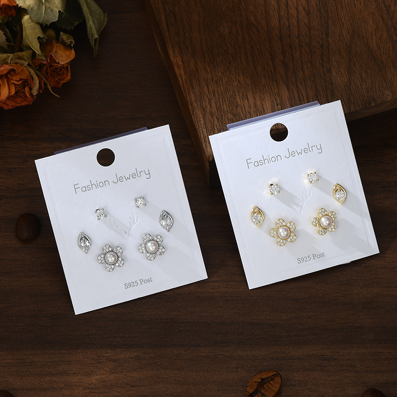 S925银针一卡三对套装耳钉女睡觉不用摘养耳珍珠耳饰精致学生耳坠 English | 投诉