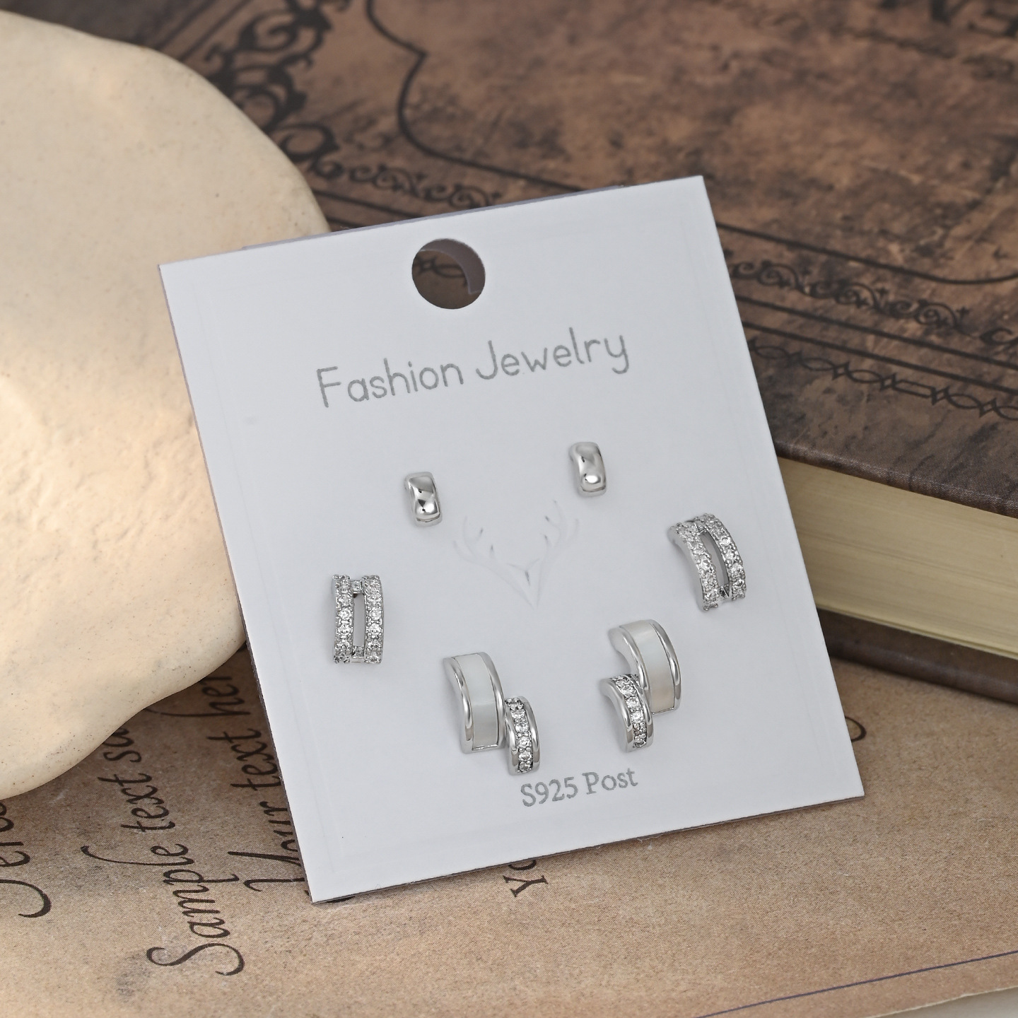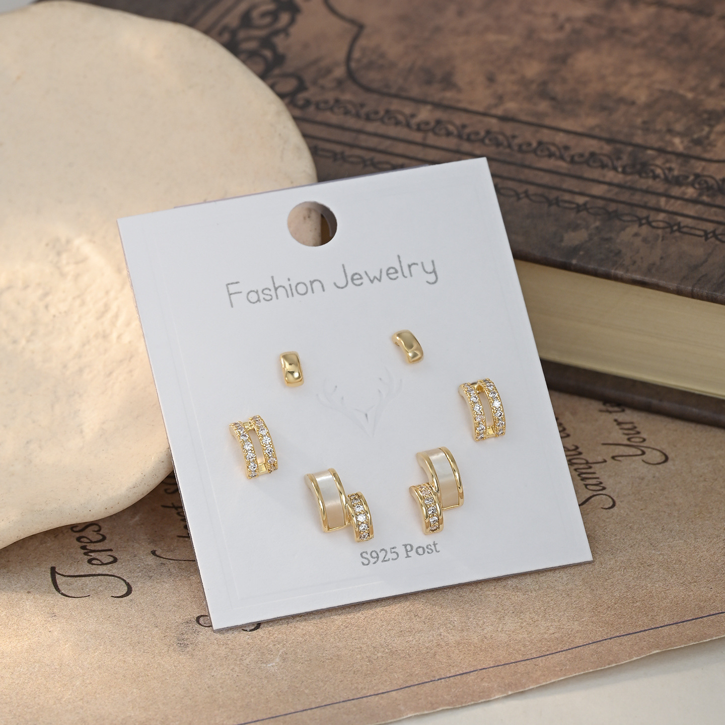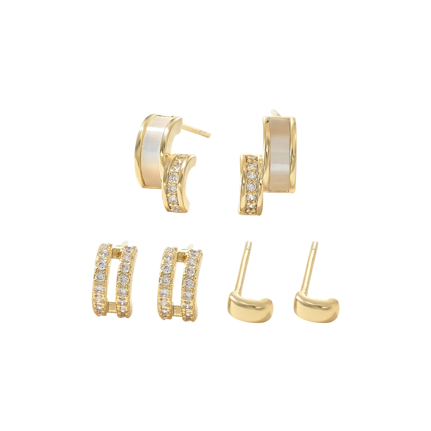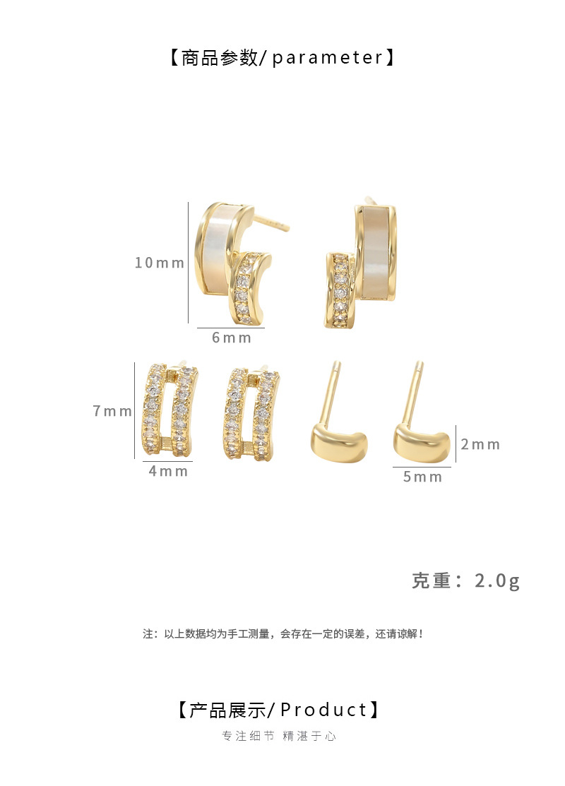 S925银针一卡三对套装耳钉女睡觉不用摘养耳贝壳几何耳饰学生耳坠 English | 投诉