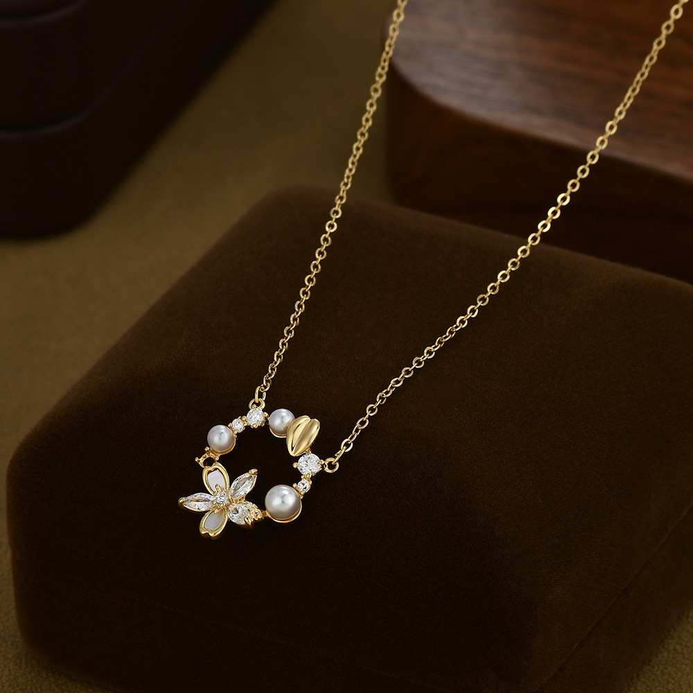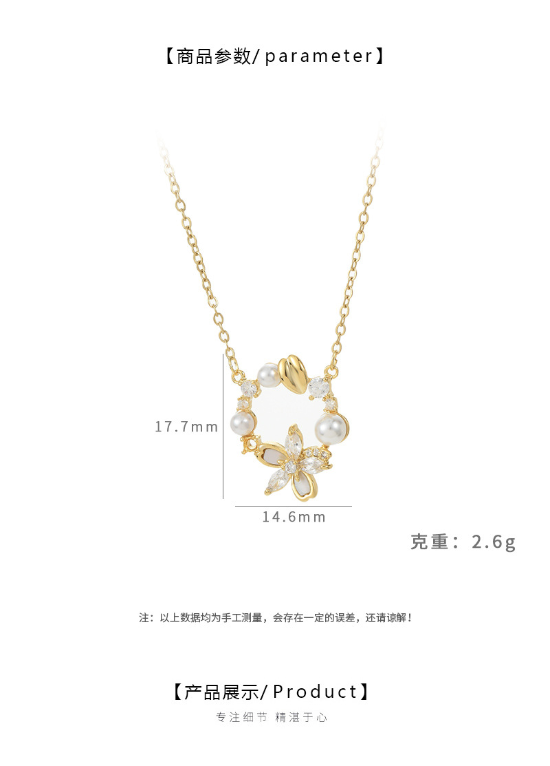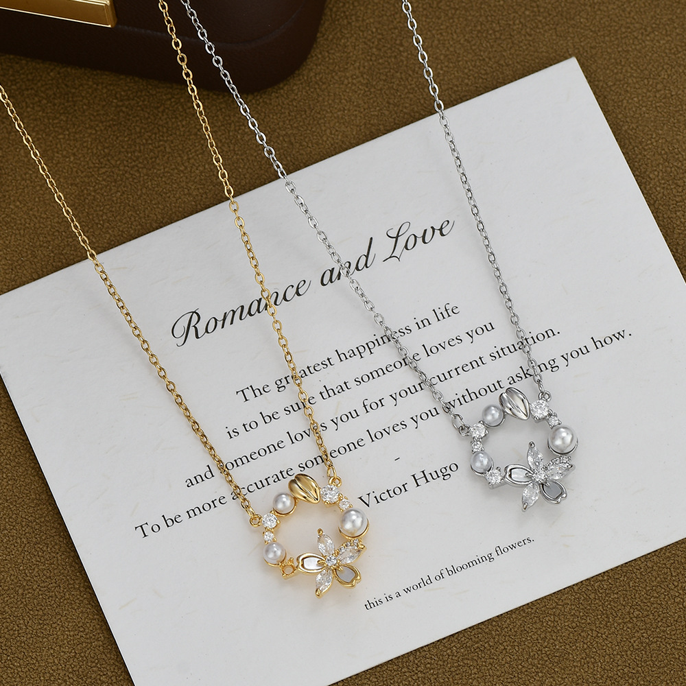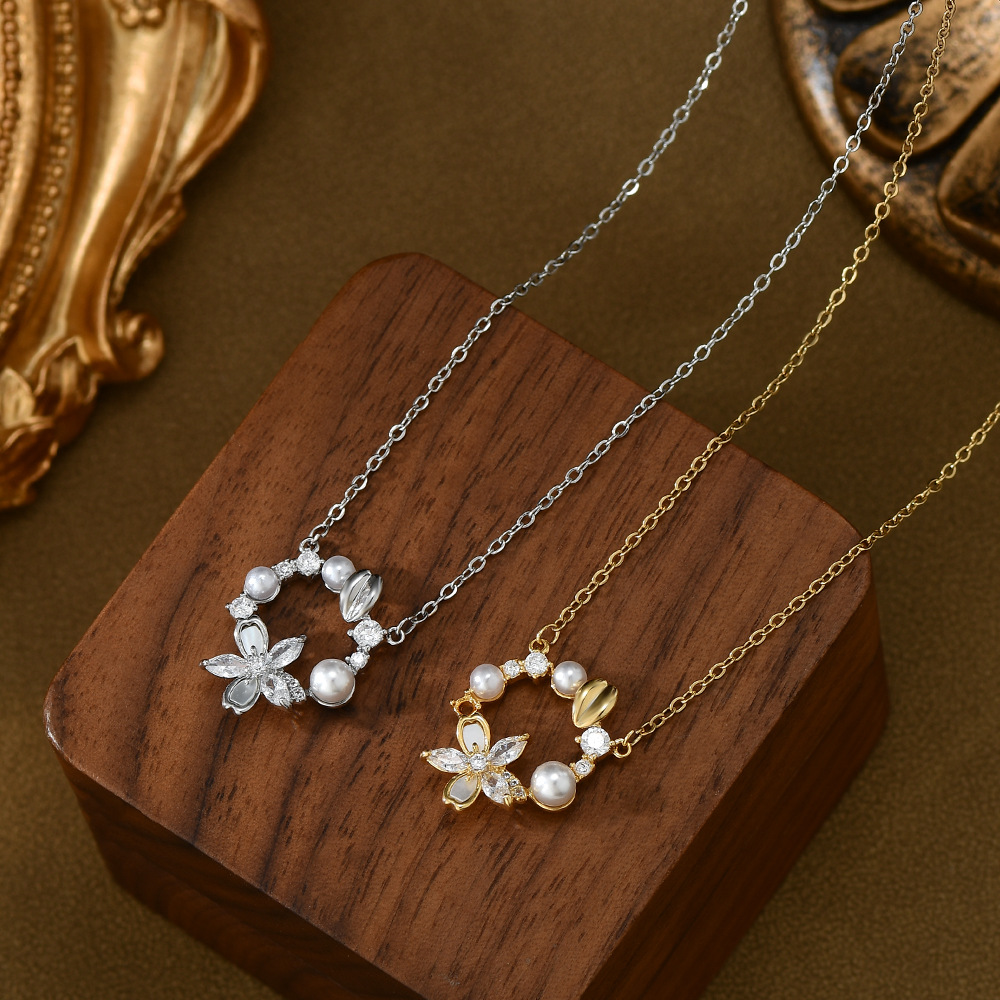 真金电镀微镶锆石气质锁骨链女复古法式珍珠花瓣项链精致百搭颈链 English | 投诉