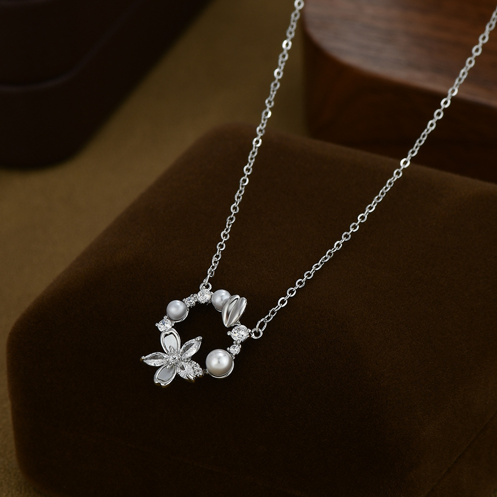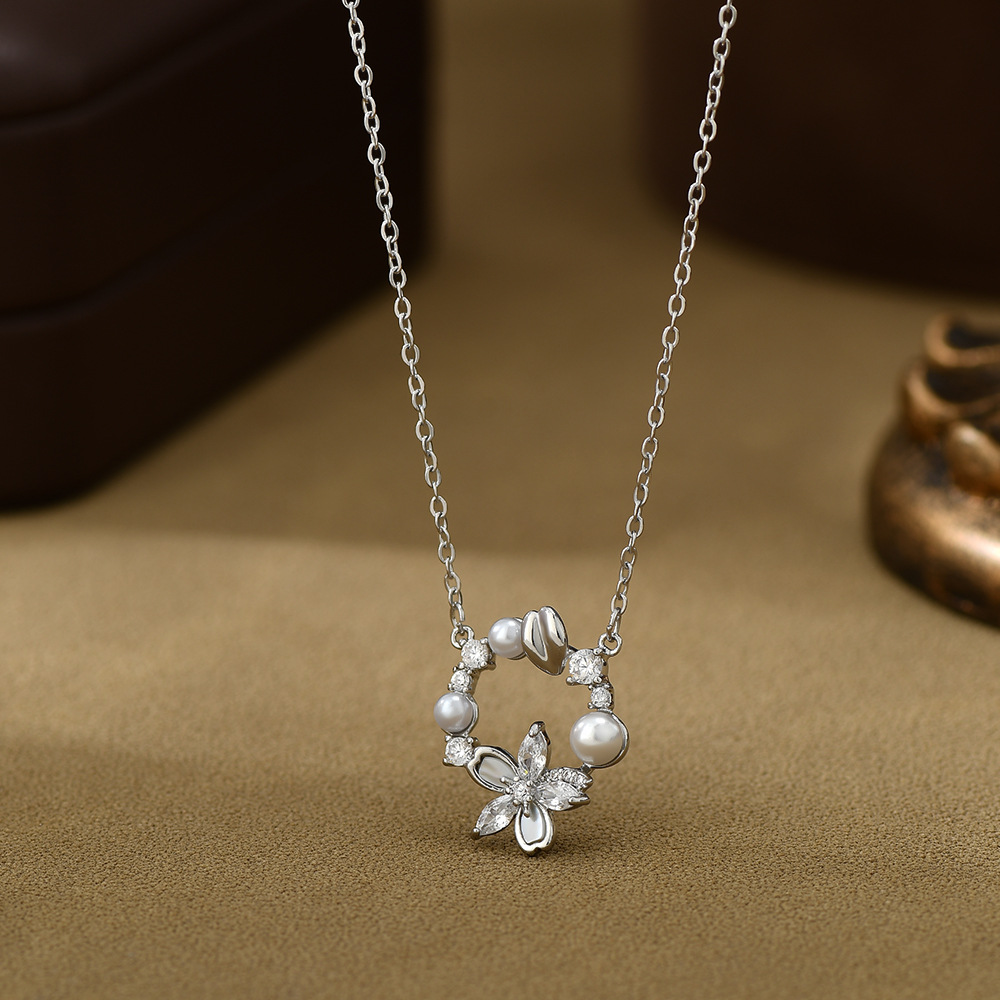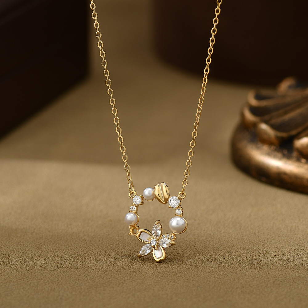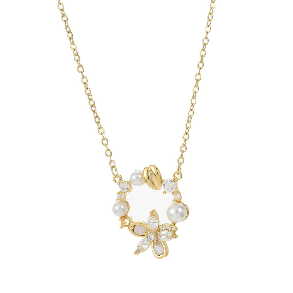 真金电镀微镶锆石气质锁骨链女复古法式珍珠花瓣项链精致百搭颈链 English | 投诉