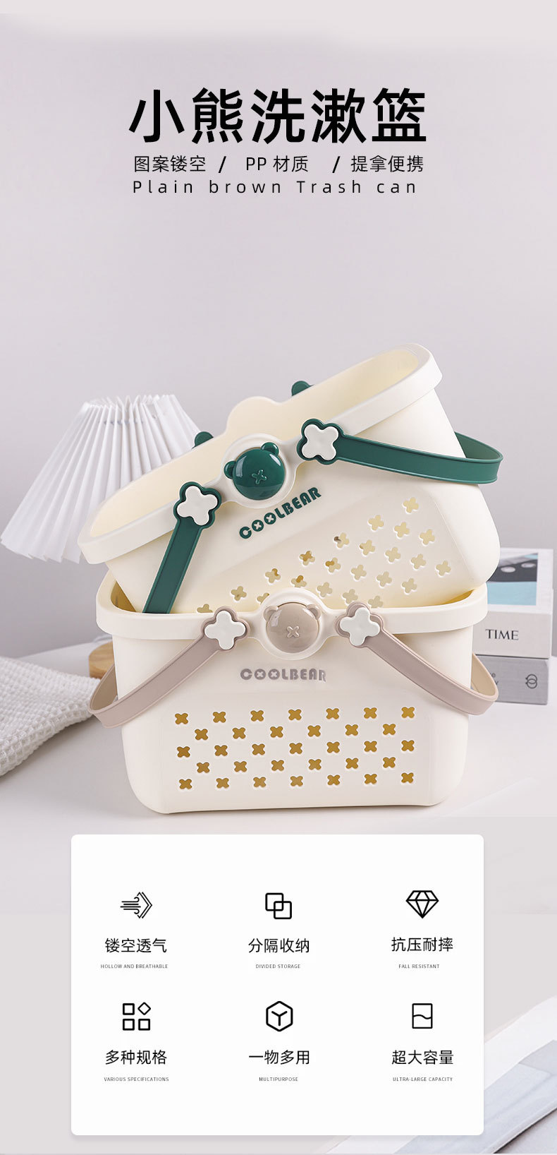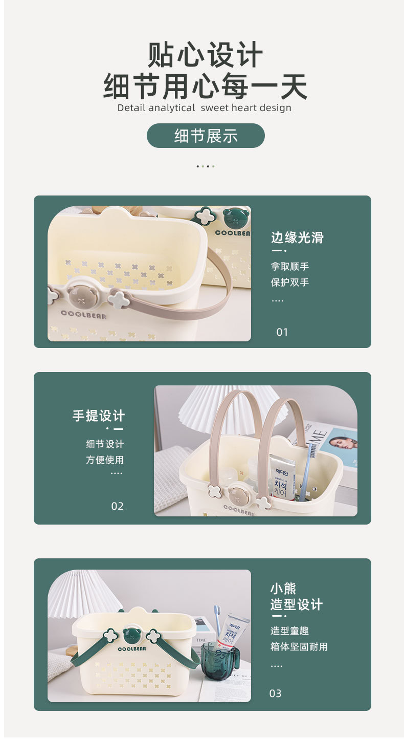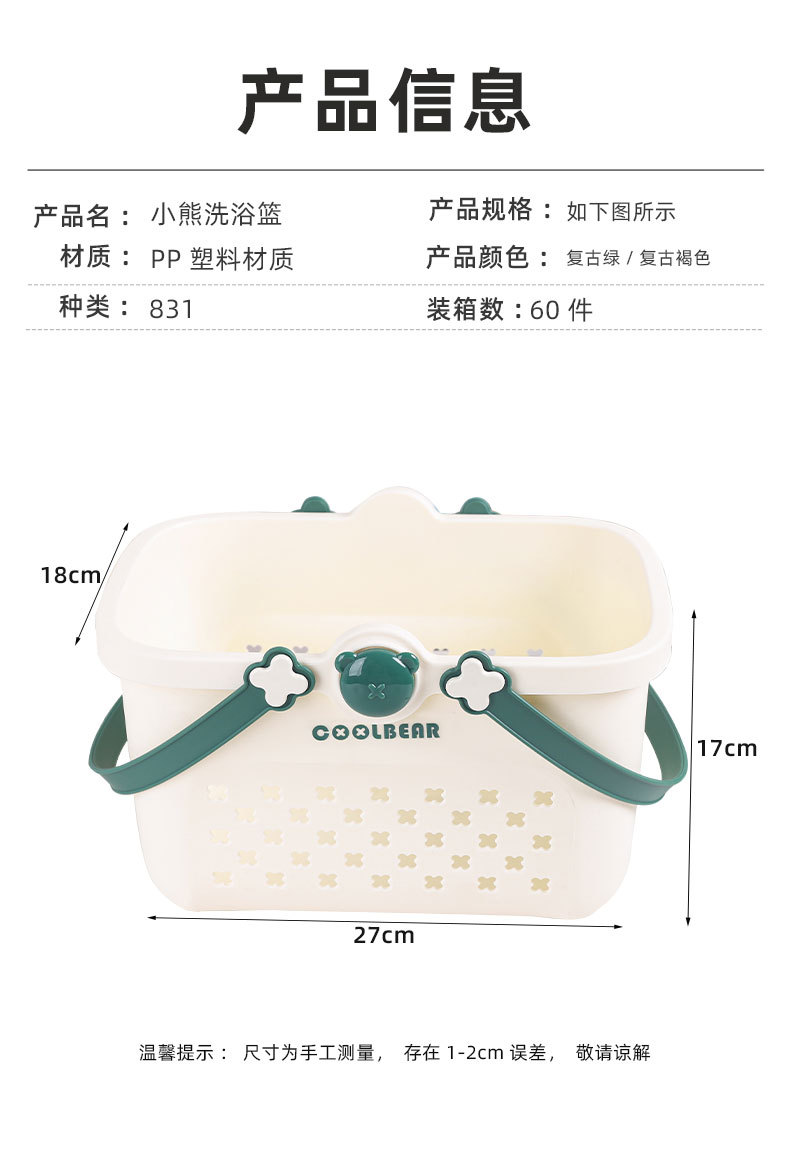 是否进口: 否 材质: 塑料 适用范围: 换洗衣物 型号: 澡篮 产地: 中国大陆 箱装数量: 60 产品类别: 收纳筐 产品上市时间: 2025 专利: 否 价格段: 5-10元 风格: 现代简约 贸易属性: 内贸+外贸 货号: 831 颜色: 小熊澡篮【绿色】,小熊澡篮【棕色】 规格: 27*18*17 主要下游平台: ebay,亚马逊,wish,速卖通,独立 主要销售地区: 非洲,欧洲,南美,东南亚,北美,东北亚, 有可授权的自有品牌: 是 是否跨境出口专供货源: 是 重量: 0.5 kg/件