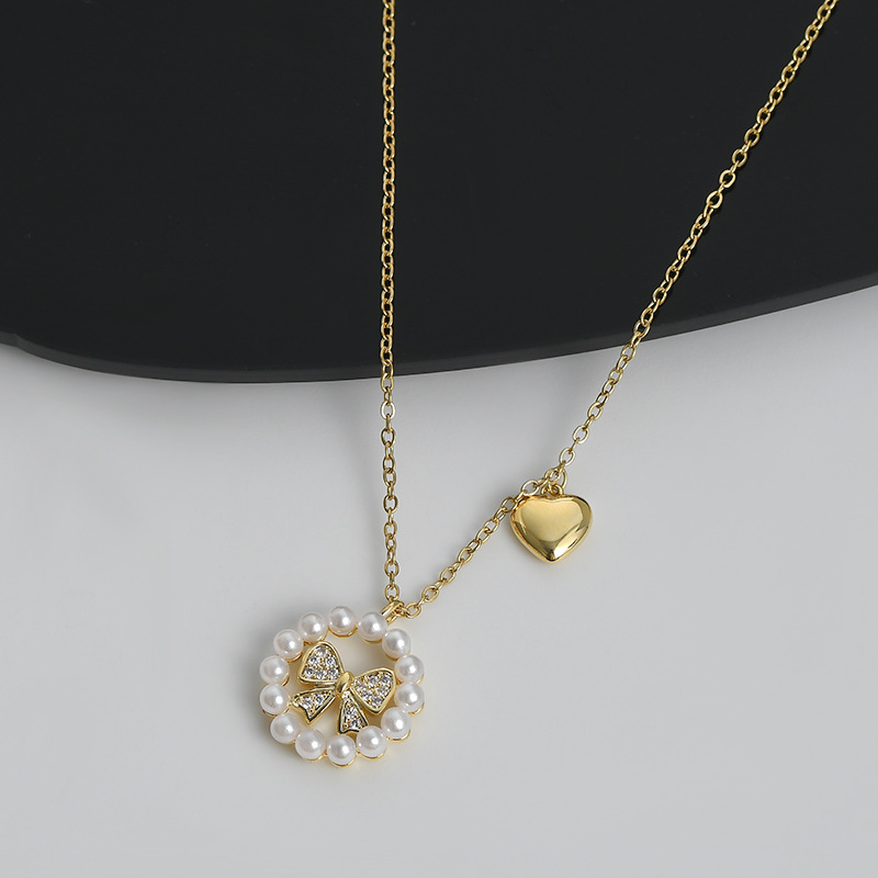 真金电镀微镶锆石气质锁骨链女复古法式珍珠蝴蝶结项链ins风颈链 English | 投诉