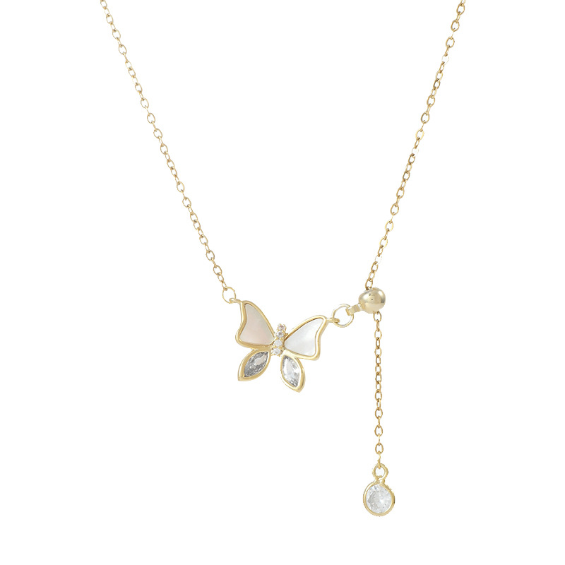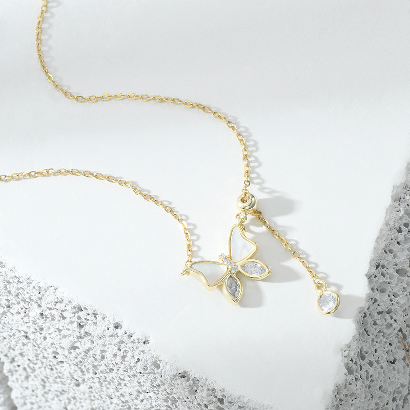 真金电镀镶锆石气质锁骨链女小众设计感贝壳蝴蝶流苏项链百搭颈链