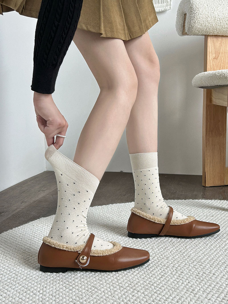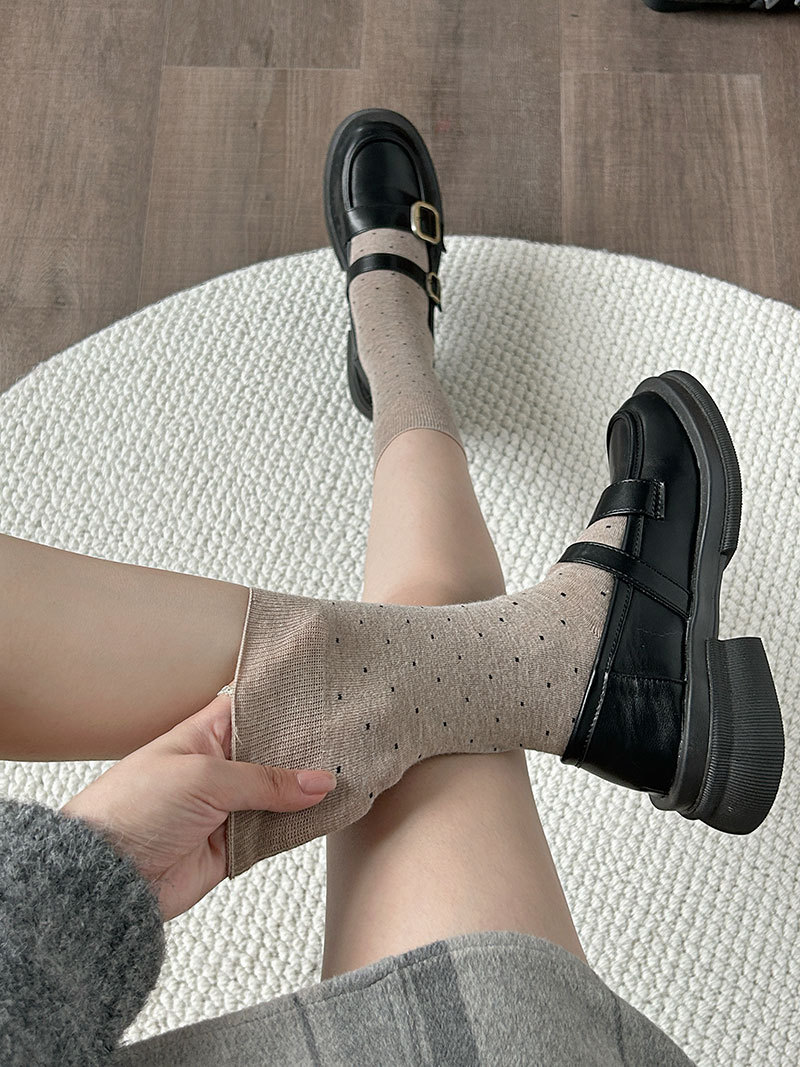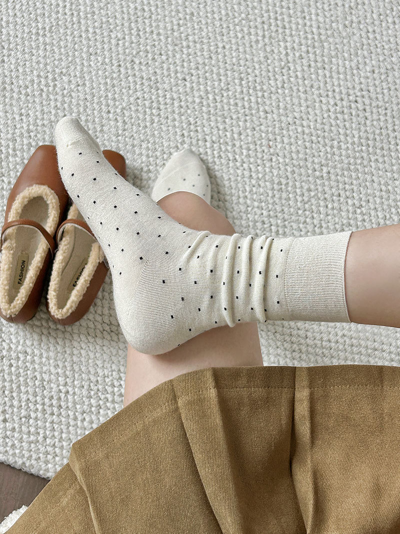 面料名称: 羊毛 无骨缝制: 是:手工无骨缝头 功能: 吸汗,防摩擦 图案: 波点 包装形式: 袋装 适用性别: 女 适用年龄段: 青年(18-40周岁) 主面料成分: 羊毛 筒高: 中筒 针数: 200N 上市时间: 2025年秋季 适合季节: 冬季,秋季 产品类别: 普通休闲袜 产地: 唐 是否跨境出口专供货源: 否 货号: 25051 品牌: MUMU WOOD 颜色: 白色,黑色,深灰,咖啡,深卡其,浅卡其 尺码: 均码 是否进口: 否 重量: 0.05 kg/双