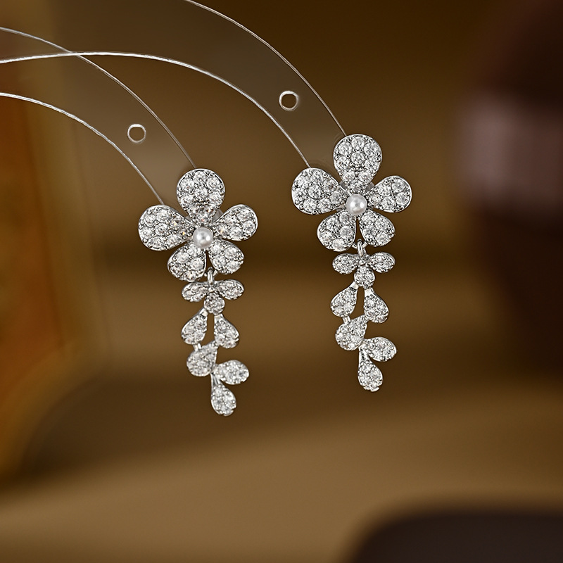 S925银针韩版时尚个性小雏菊耳钉女高级感锆石花瓣耳饰品流苏耳环