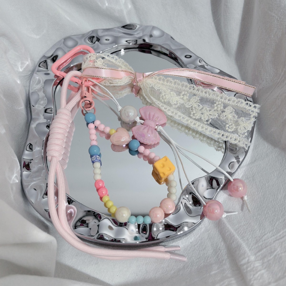 ins风跨境粉色系编织彩绳包包挂饰手绘串珠手机挂件钥匙扣配件批 投诉