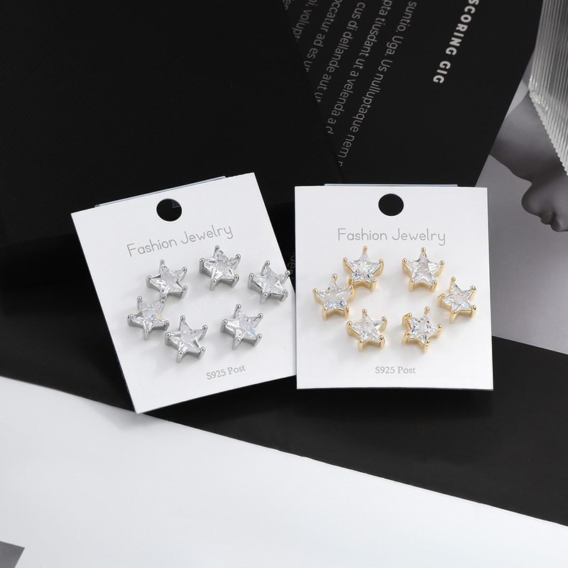 S925银针一卡三对套装耳钉女睡觉不用摘五角星耳饰品精致学生耳坠