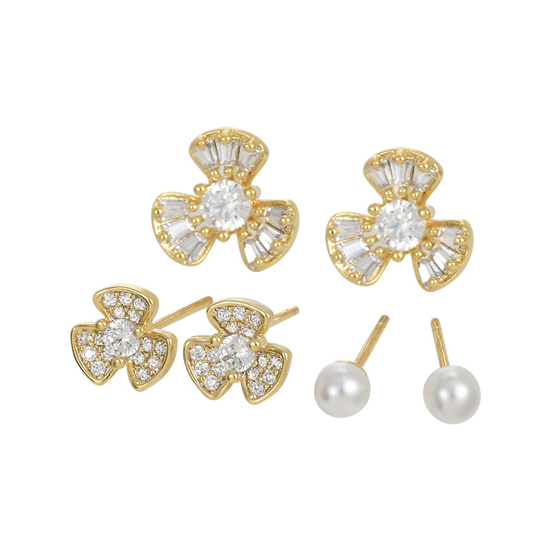 S925银针一卡三对套装耳钉女精致珍珠花瓣耳饰品简约百搭学生耳坠