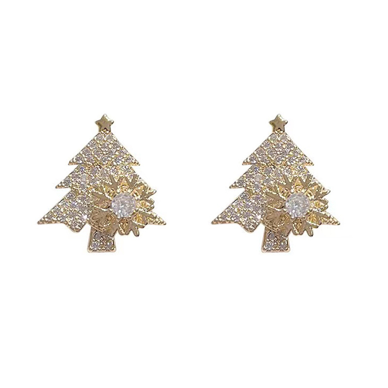 S925银针可旋转雪花锆石圣诞树耳环甜美少女心时尚耳钉圣诞耳饰品