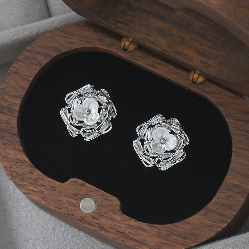 春夏新款微镶锆石个性耳钉女S925银针高级感贝壳花瓣耳饰精致耳坠