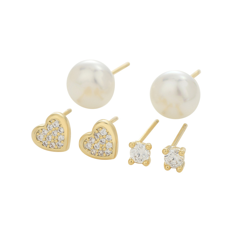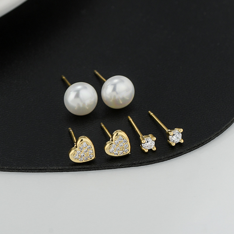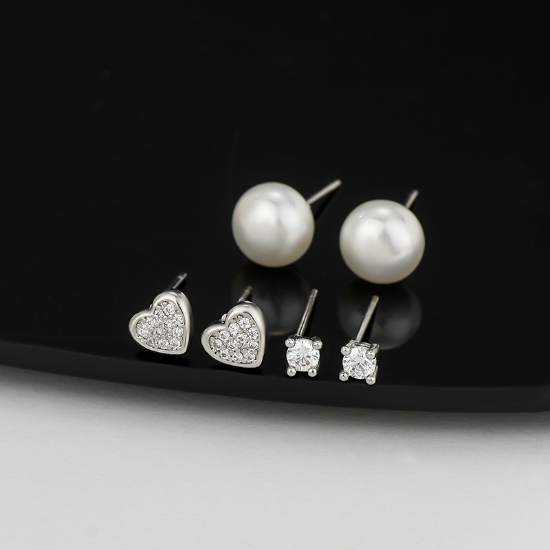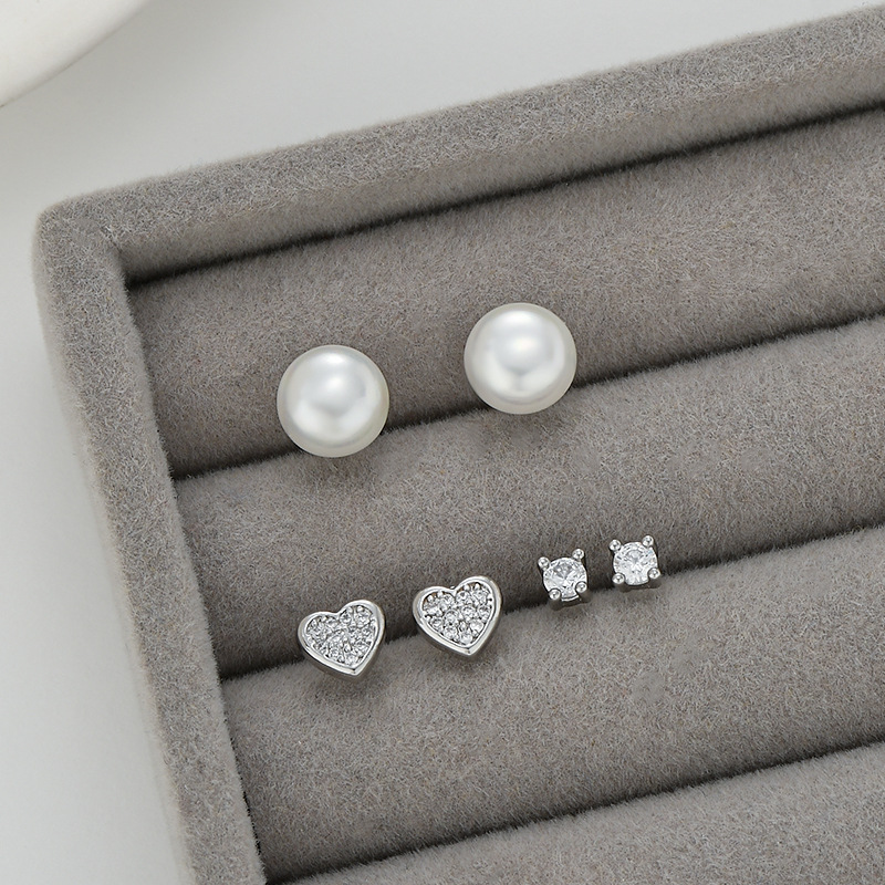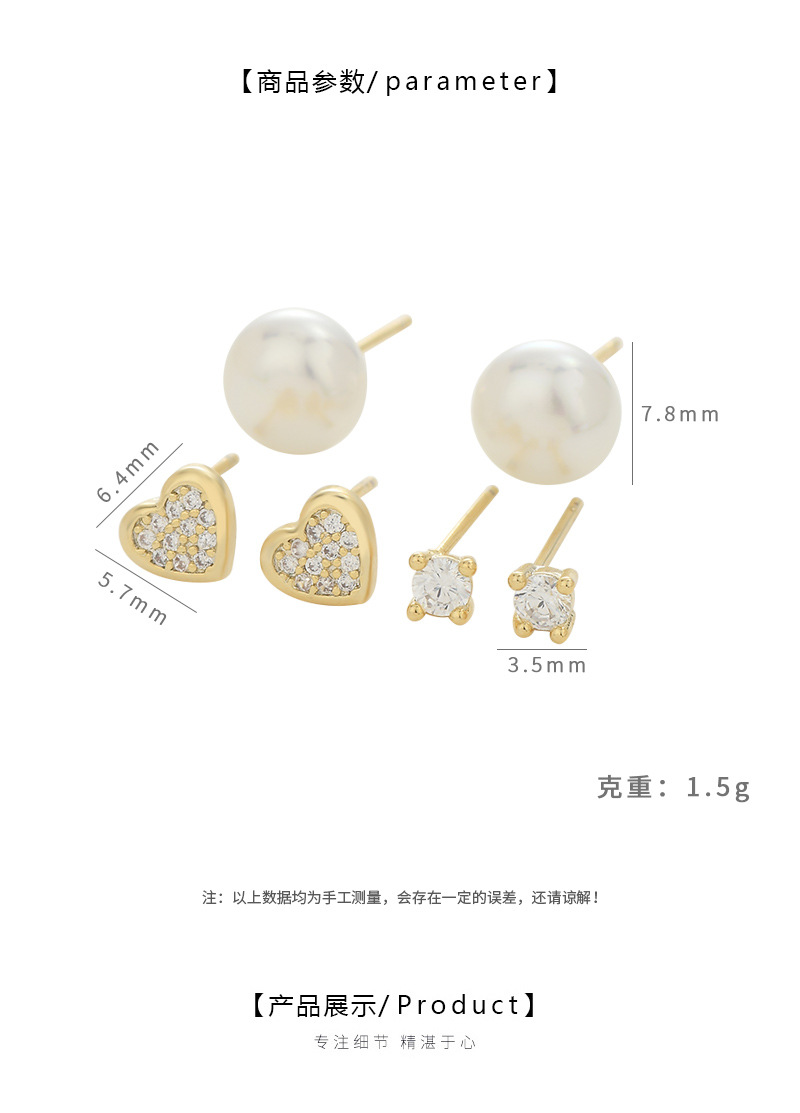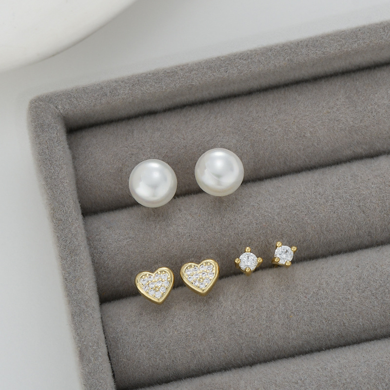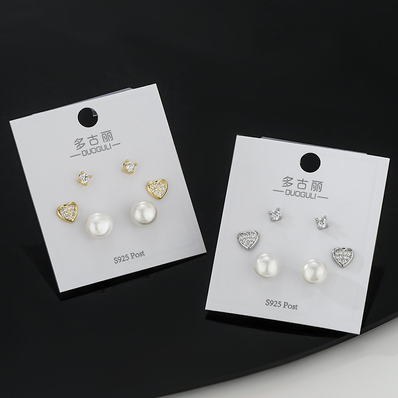 S925银针新款珍珠微镶满钻爱心一卡三对耳钉女轻奢百搭三件套耳饰 English | 投诉