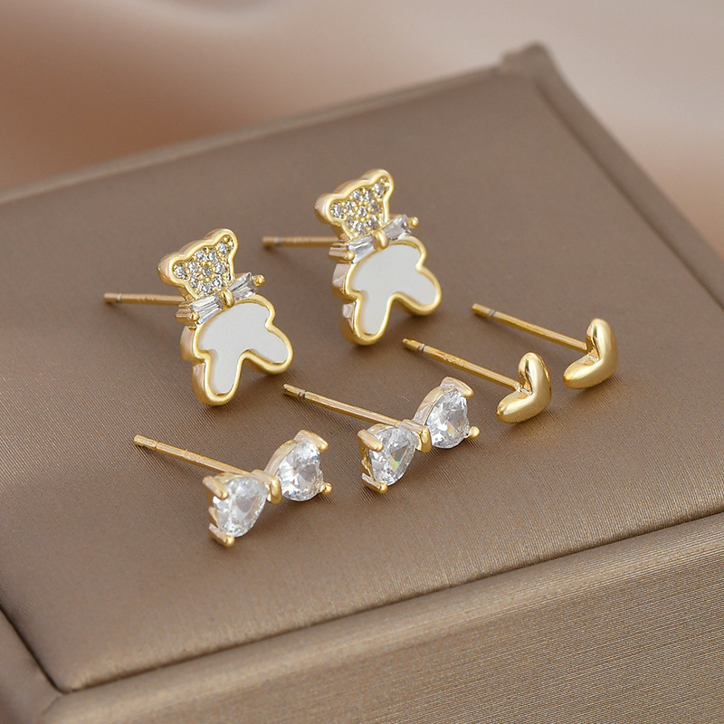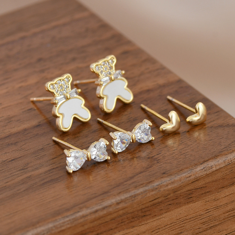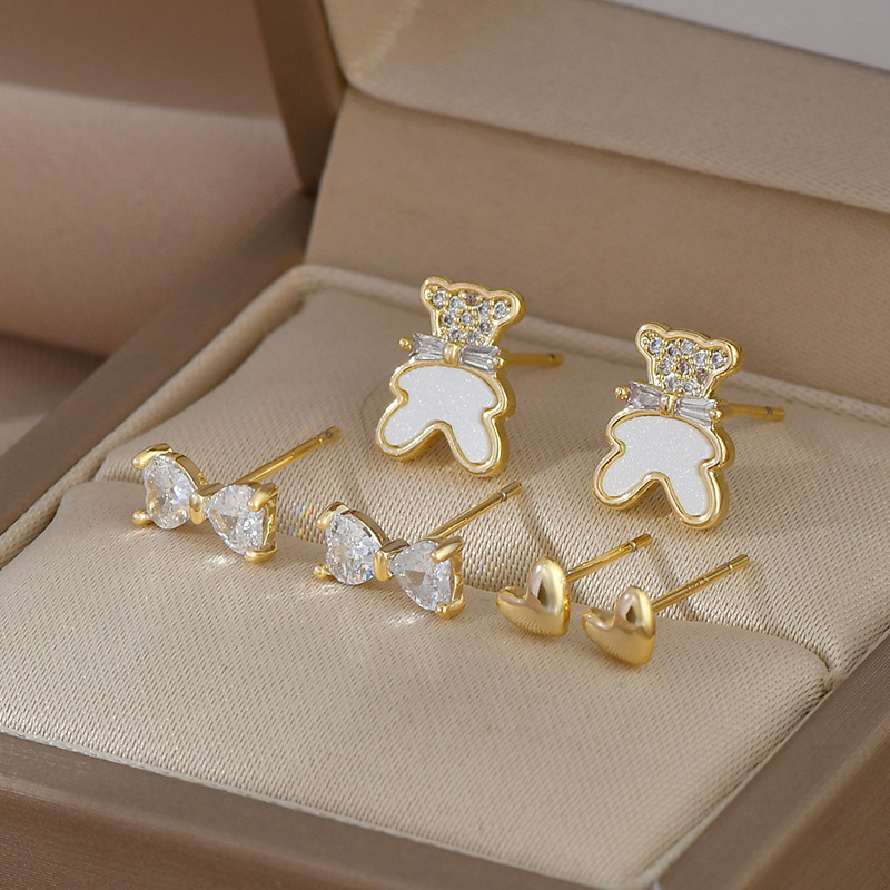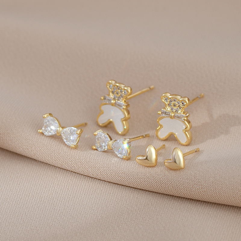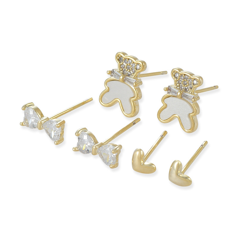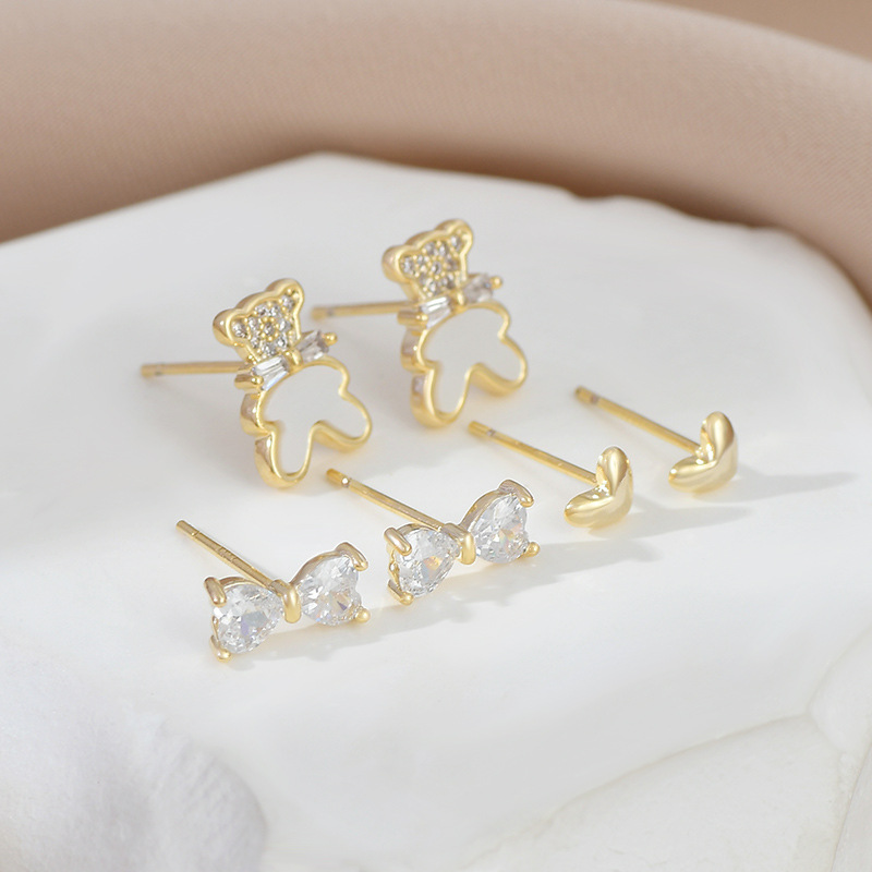 S925银针一卡三对简约耳钉套装女小巧精致耳环小熊蝴蝶结爱心耳饰 English | 投诉
