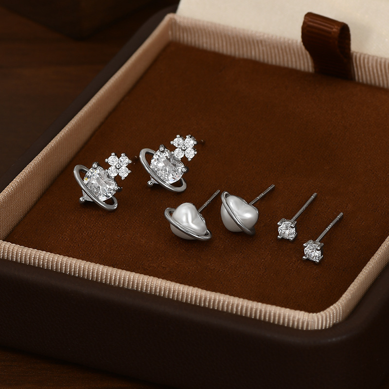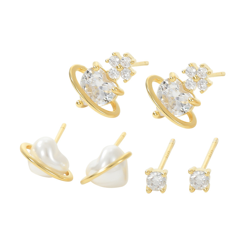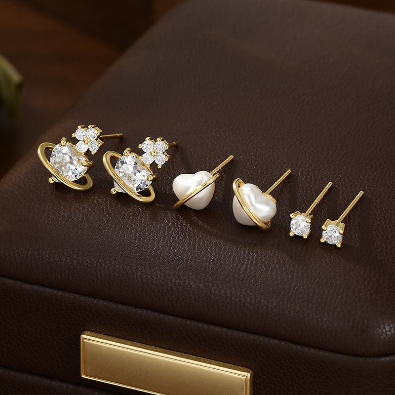 S925银针一卡三对套装耳钉女爱心珍珠养耳小耳饰精致百搭学生耳坠