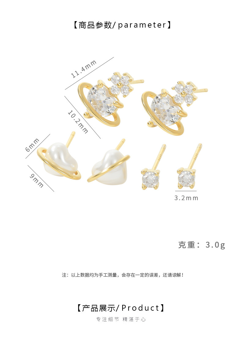 S925银针一卡三对套装耳钉女爱心珍珠养耳小耳饰精致百搭学生耳坠 English | 投诉