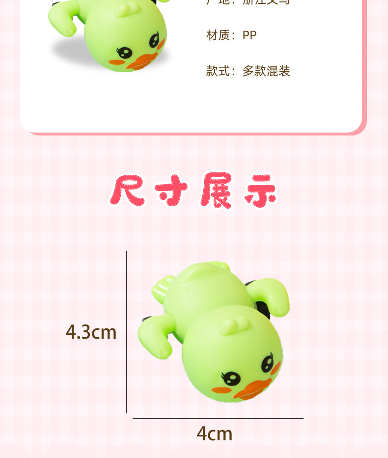 材质: PP 前进方式: 回力 外观造型: 动物 产地: 澄海义乌 功能: 后拉向前惯性滑行的回力小车玩具 规格: 动物回力车 货号: 无壳鸭 品牌: 蛋仔乐 包装方式: pp袋,OPP,OPP袋,纸箱+编织袋打 能力培养: 情感,视觉,智力开发,爬行,动手动脑,抓 是否有动漫形象: 否 是否有导购视频: 否 是否专供外贸: 否 3C配置类别: 14岁以下的塑胶玩具 商品3C认证码: 2021152202035916 颜色: 无壳鸭回力车 是否跨境出口专供货源: 否 适用年龄: 儿童(4-6岁) 重量: 0.008 kg/个
